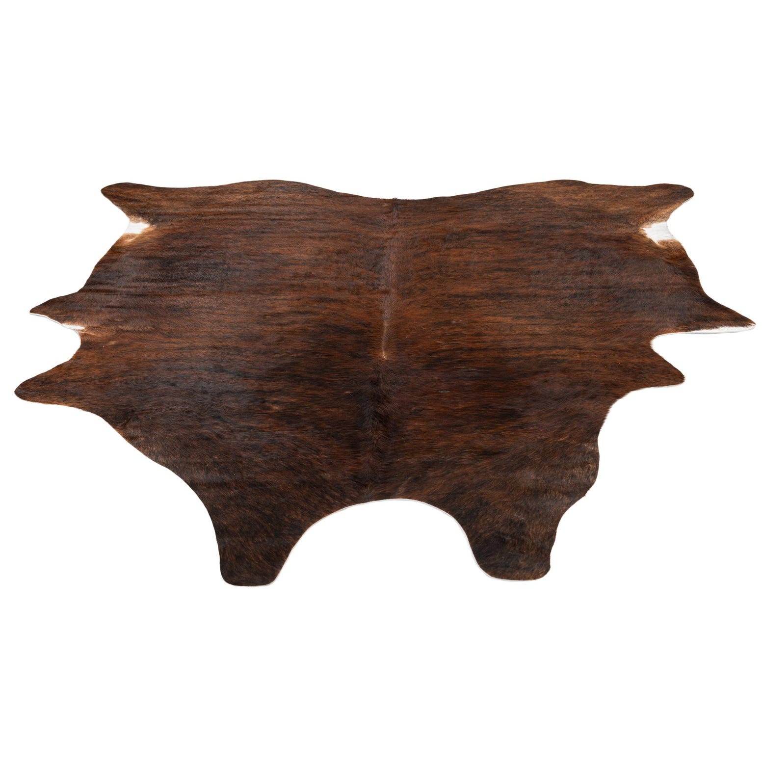 A 5x8 rectangular cowhide rug in varying shades of brown and tan with natural, organic edges and small white accents.
