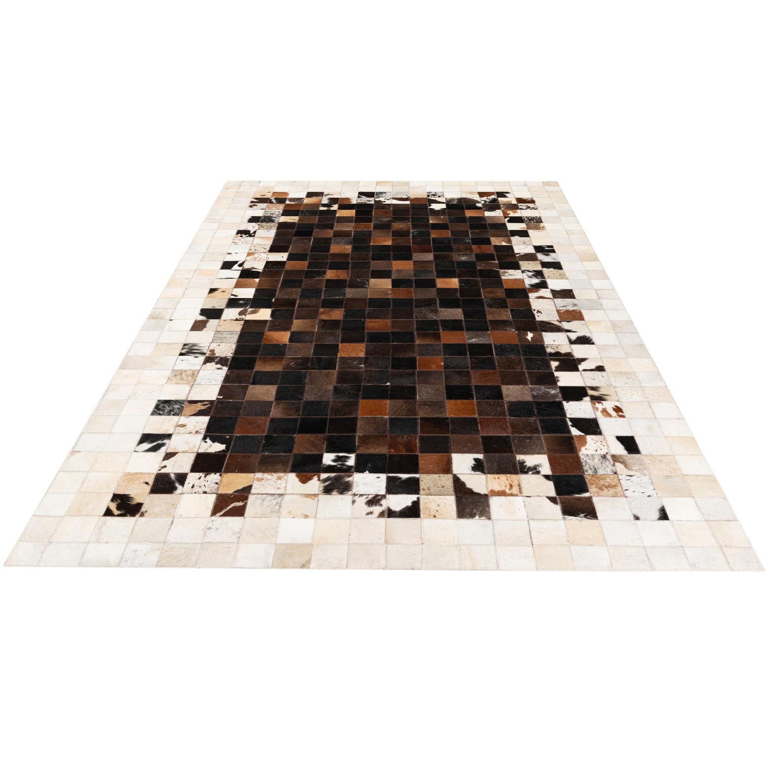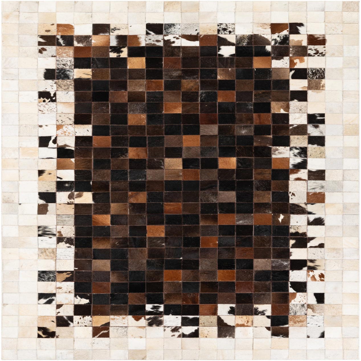 A mosaic of hand-cut cowhide squares creates a refined checkerboard with a deep brown field at its center and a lighter, mottled border that alternates ivory, beige and tan patches with black-and-white markings. The background color is brown, anchoring the piece while individual hides show natural variations in tone from rich chocolate and espresso to warmer tan highlights. Each square retains its hair-on texture and a subtle leather sheen, so the surface reads tactile and layered rather than flat.