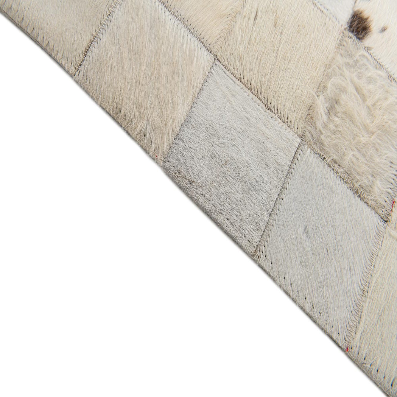 Hand made of cowhide and leather, this rug brings organic texture and a tailored geometric pattern to a room. It pairs naturally with warm wood furniture and leather seating for a cohesive, grounded look; layer it over hardwood or a sisal base in a living room or place it under a dining table to define the space. The neutral palette and mixed markings also complement industrial metal accents, modern farmhouse interiors, or an office with muted textiles and matte-black hardware.