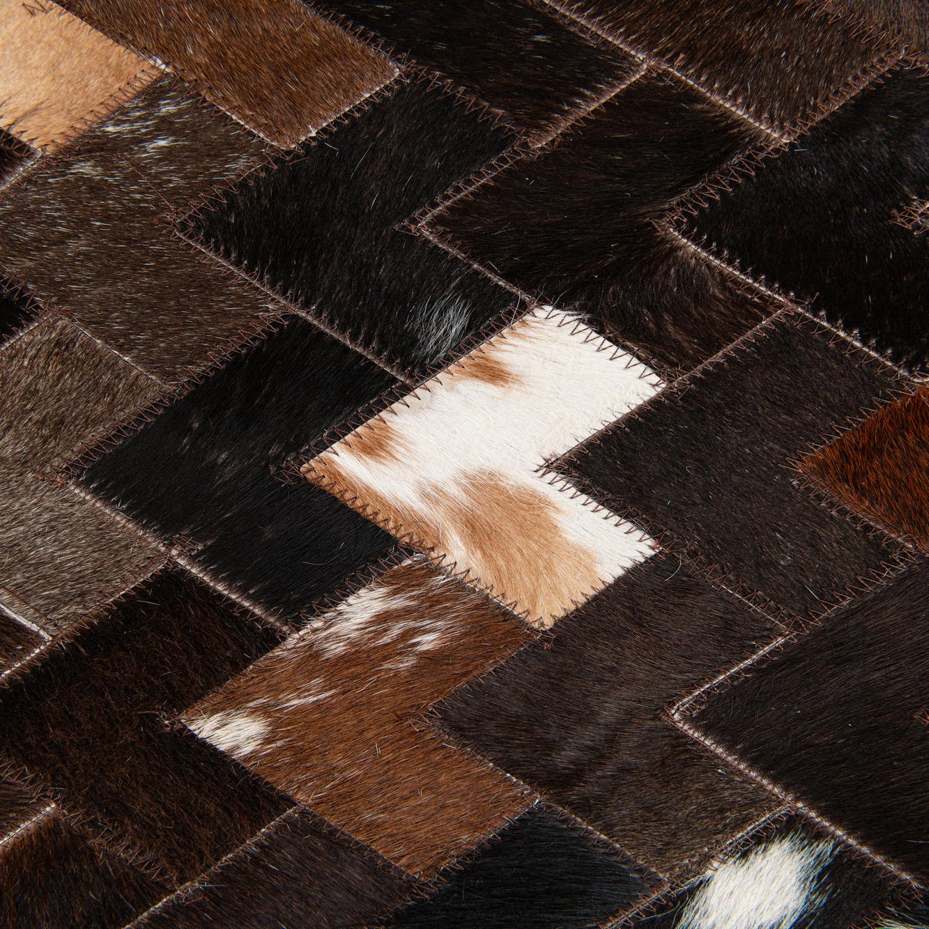 The surface is hair-on-hide with a low, smooth nap that feels soft underfoot and shows a gentle sheen as the hair catches the light. Hand-stitched seams between patches add a tactile structure you can feel, while the leather backing gives the piece a stable, grounded weight. Place this rug beneath a low coffee table to anchor a living area with warm wood tones and leather seating, layer it in a loft-style space with matte black metal accents for contrast, or use it in an entry or home office to introduce texture and depth without dominating the room.