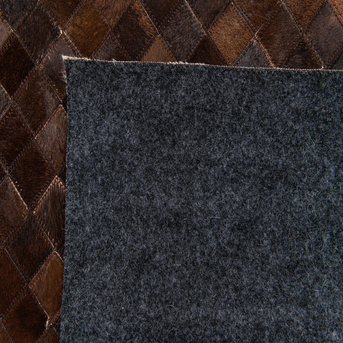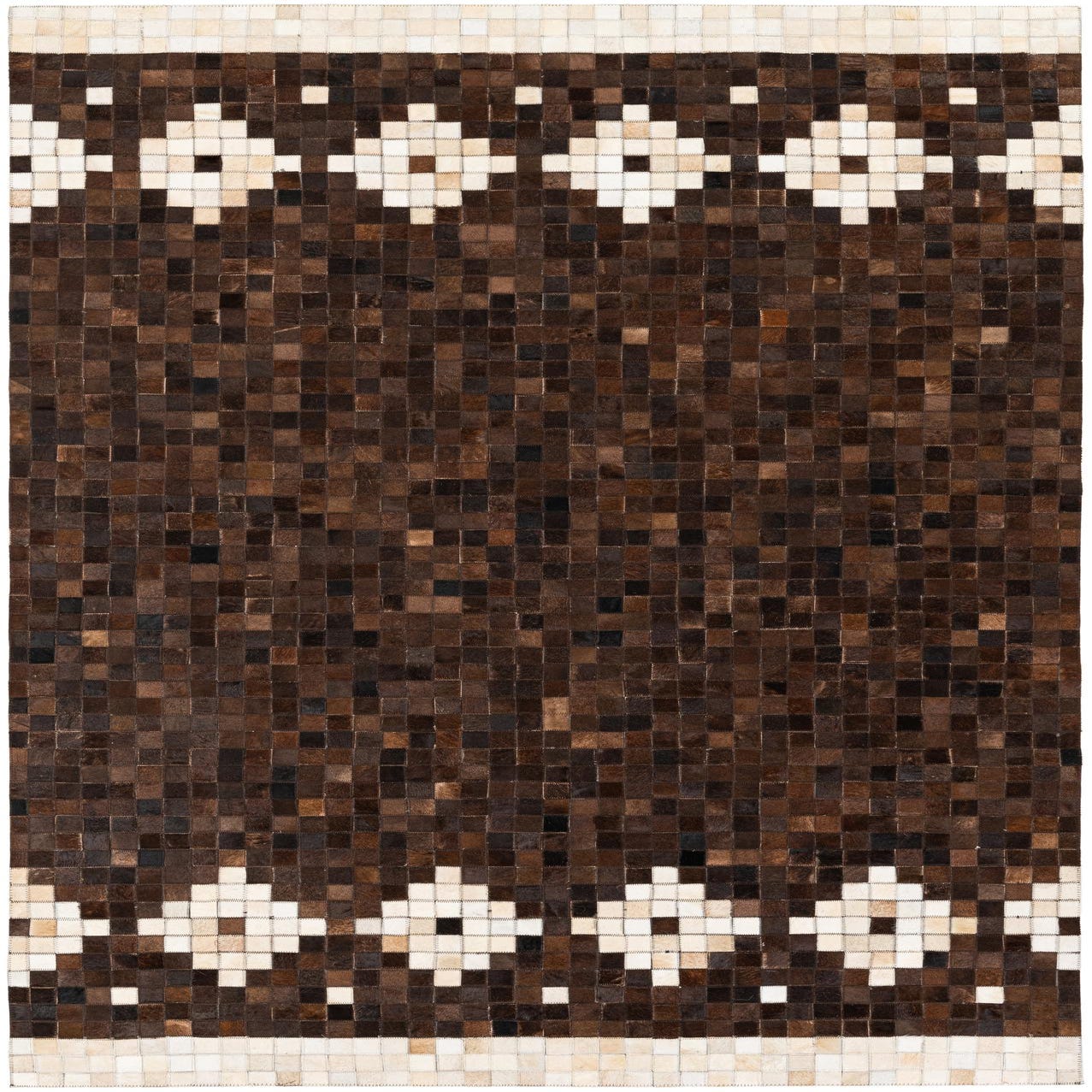 A rectangular 5x8 modern cowhide rug with a mosaic of brown and tan squares, featuring white diamond patterns at both ends.