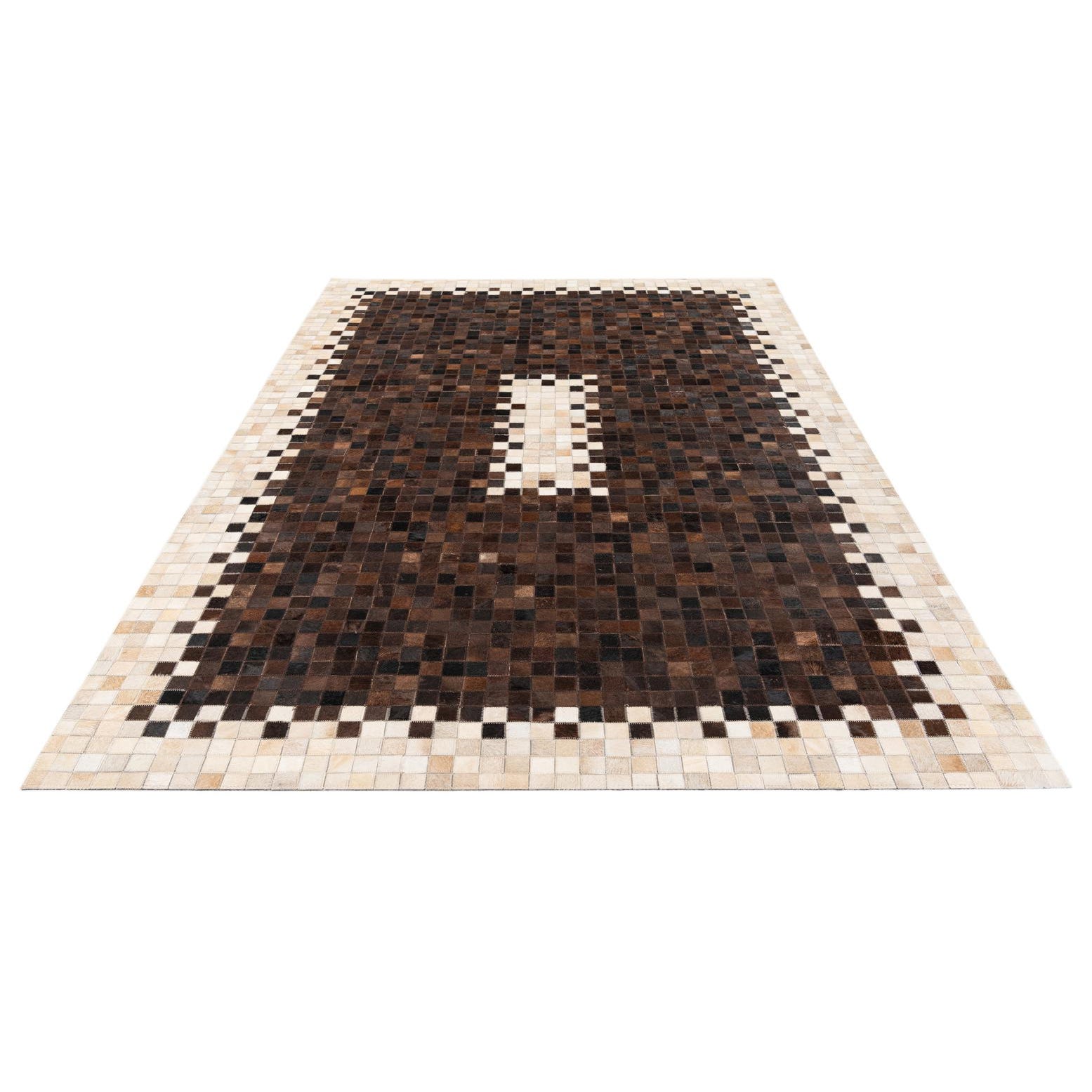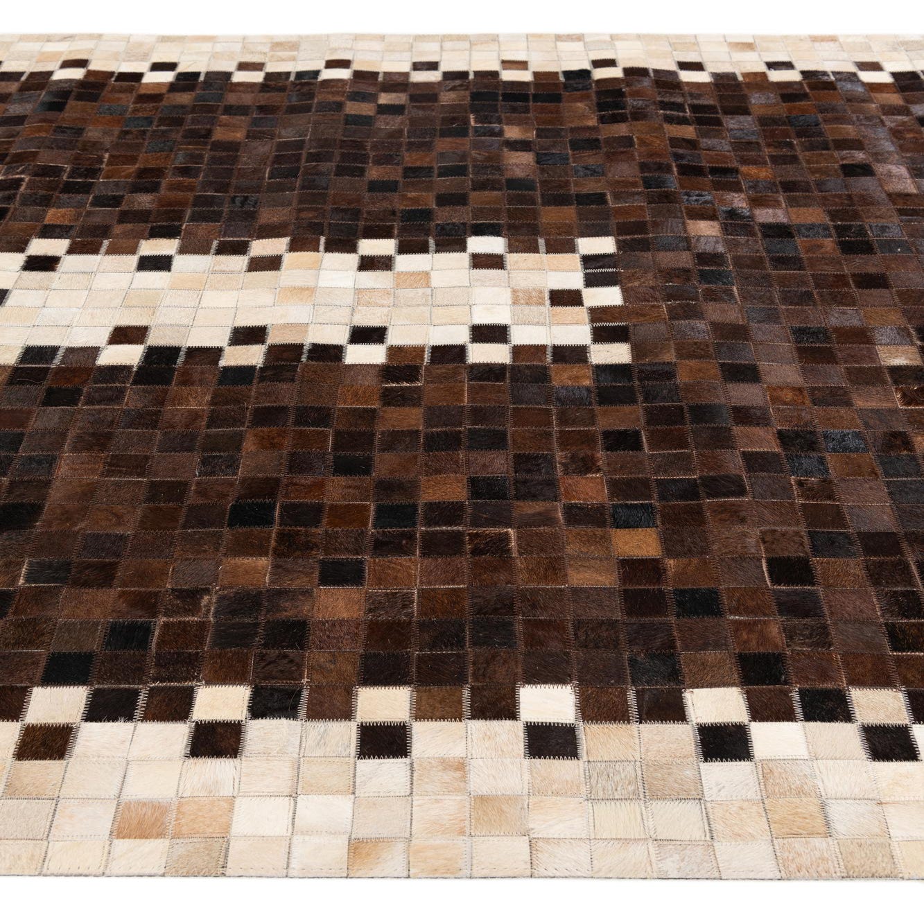 A 5x8 rectangular Cowhide Stocks rug featuring a modern mosaic pattern of brown and tan cowhide squares, with a lighter tan border.