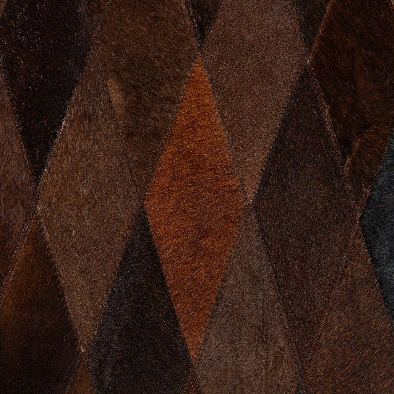 A 5x8 rectangular Cowhide Stocks rug by Rugs.com, featuring a modern diamond pattern in various shades of brown and tan, suitable for a living room.