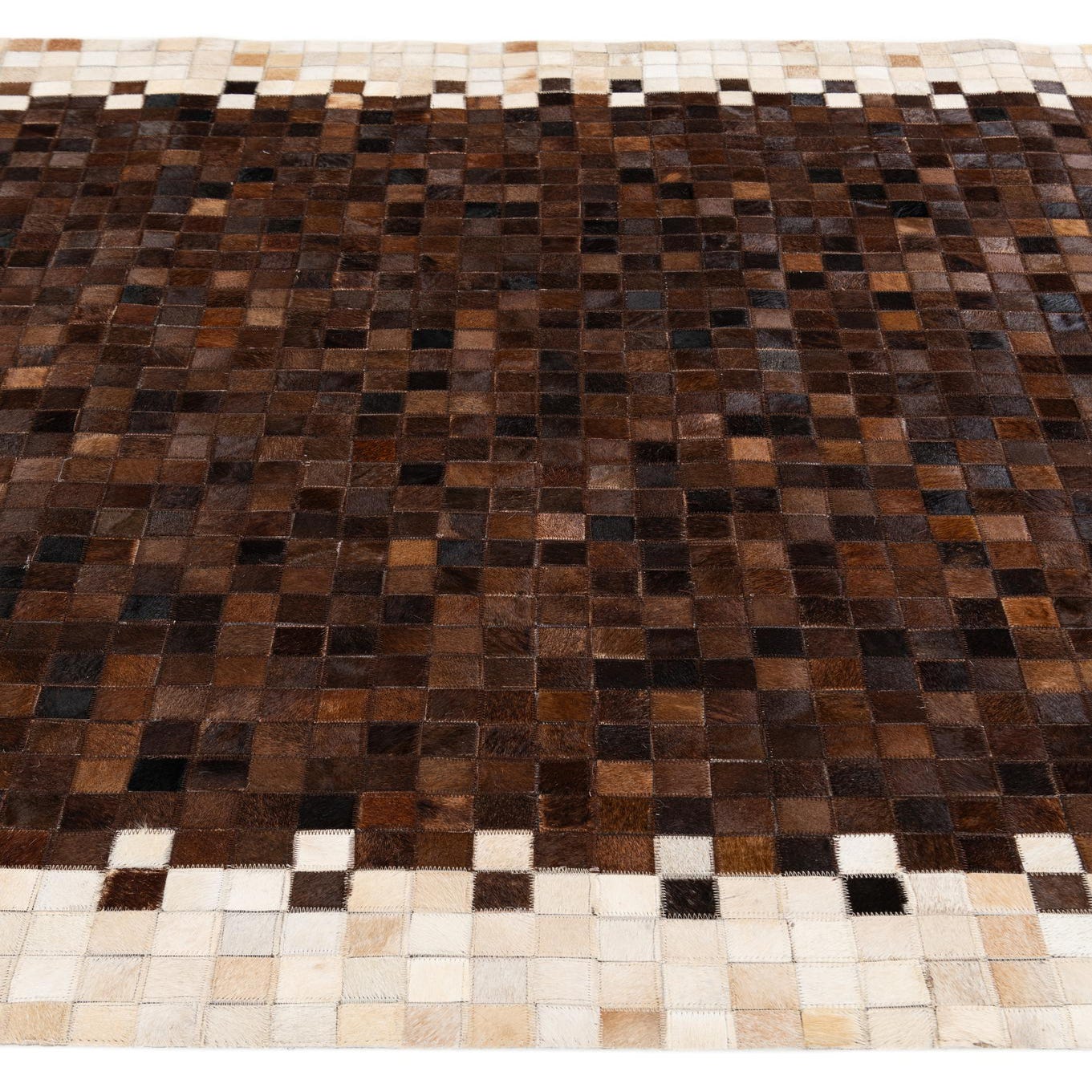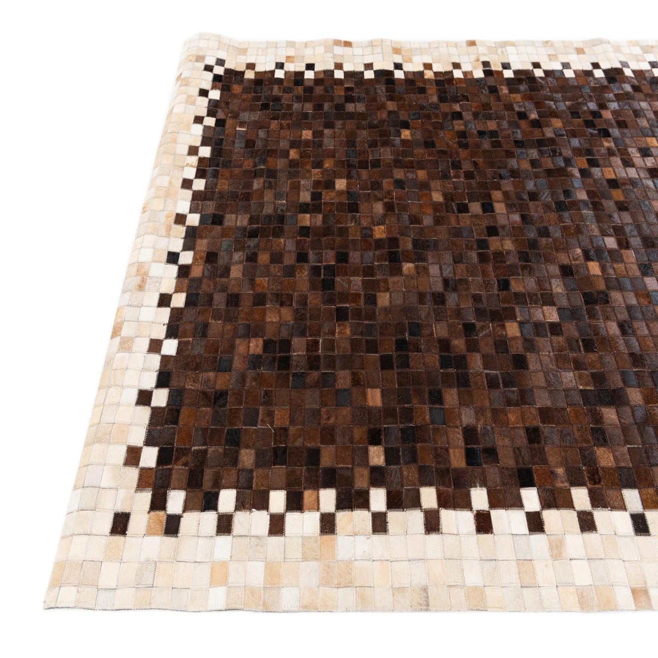 A 5x8 rectangular Cowhide Stocks rug featuring a modern mosaic pattern of brown and tan squares with a checkered border.