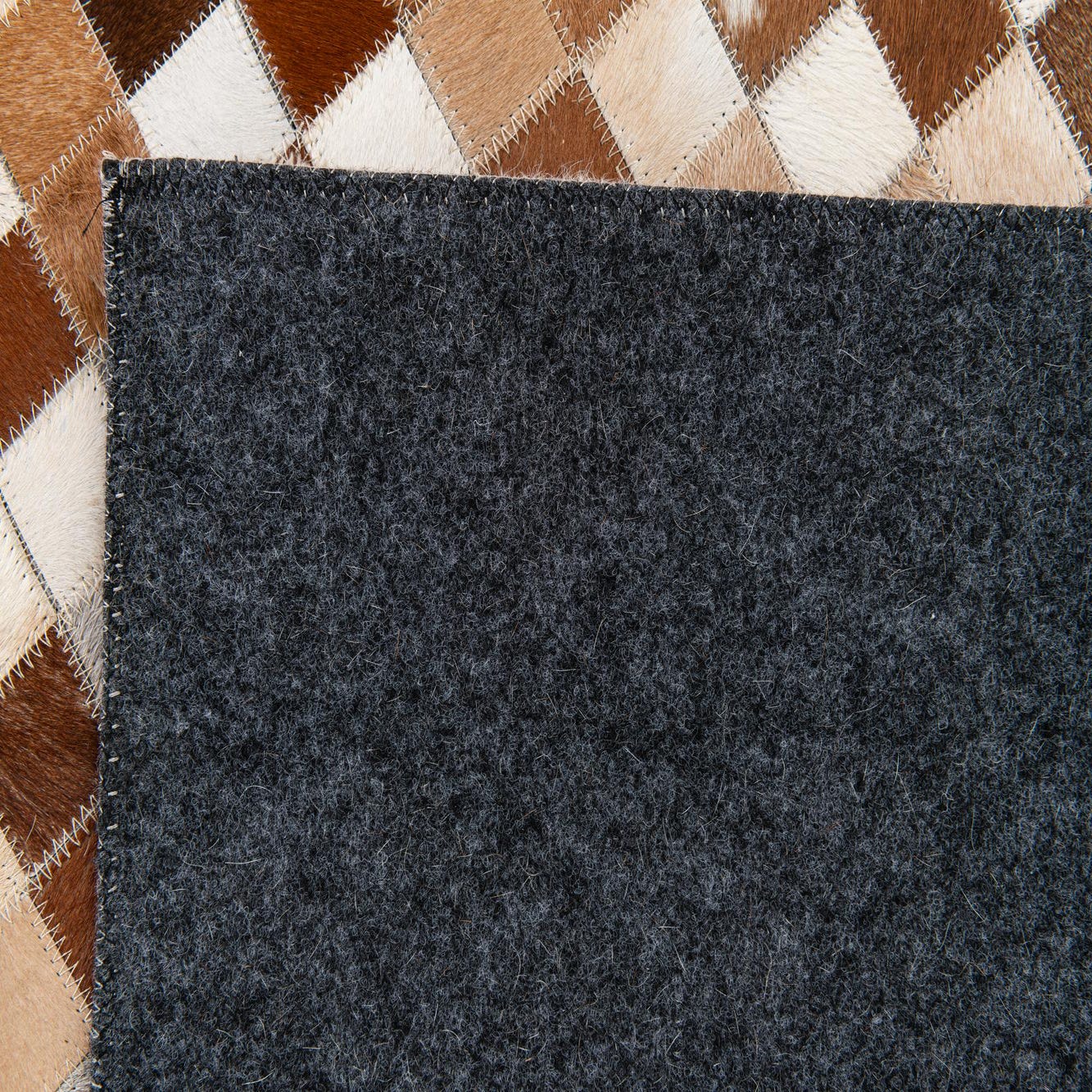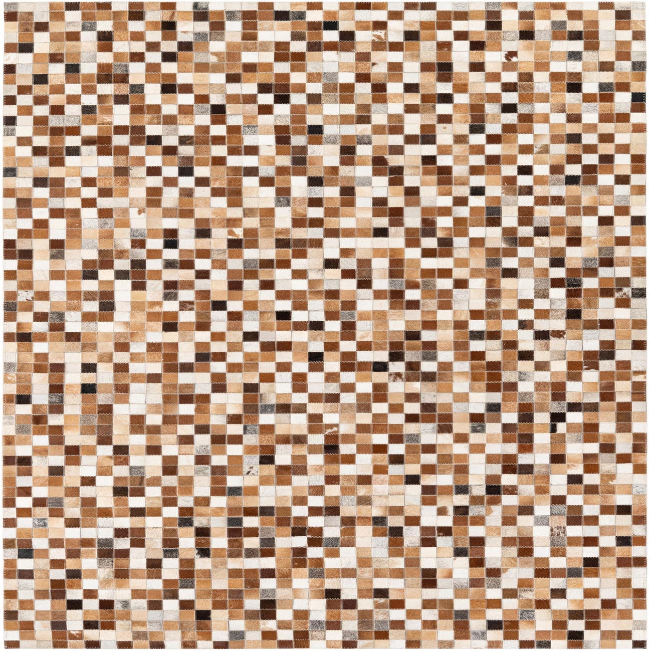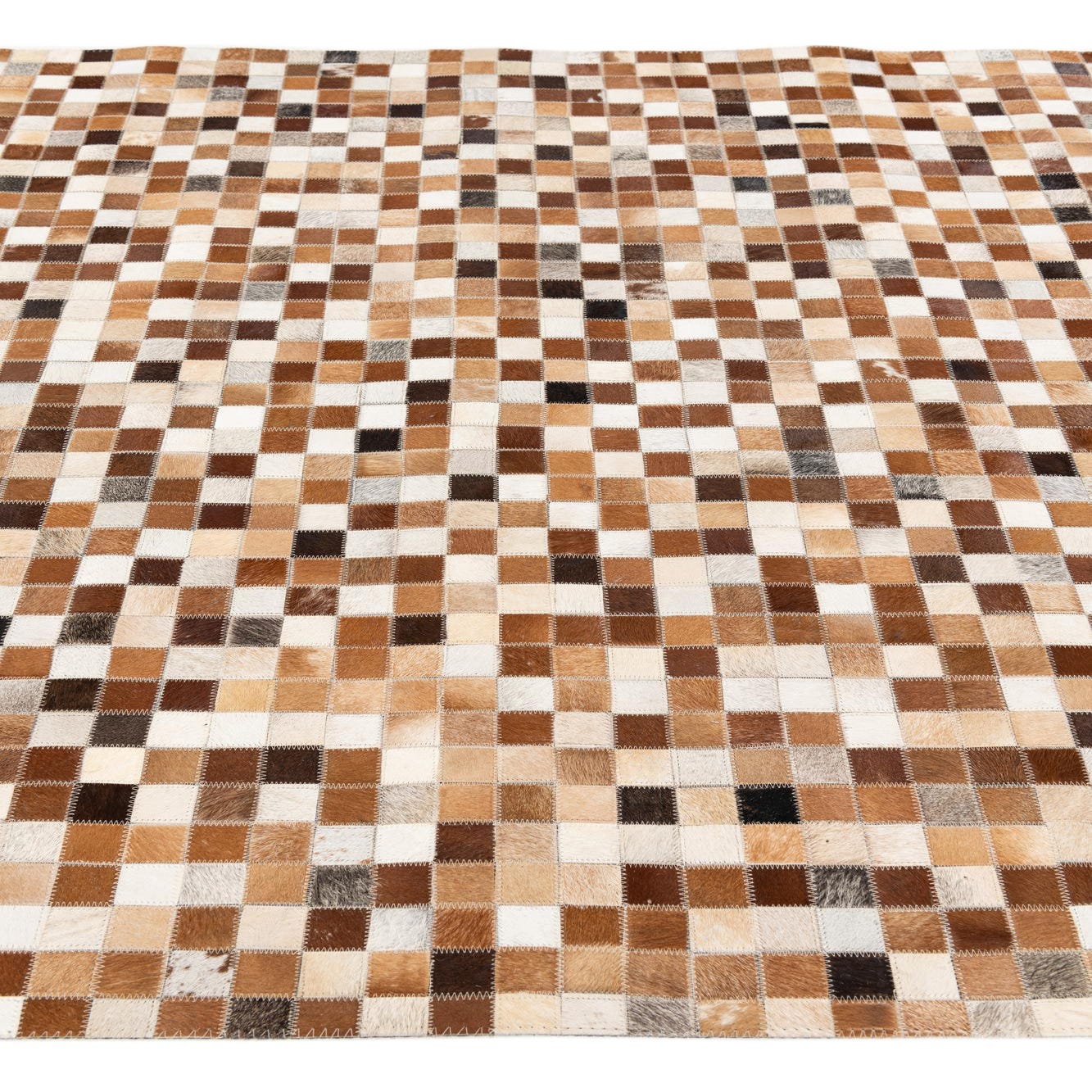 A rectangular 5x8 patchwork cowhide rug with a geometric pattern in various shades of brown, tan, and cream.