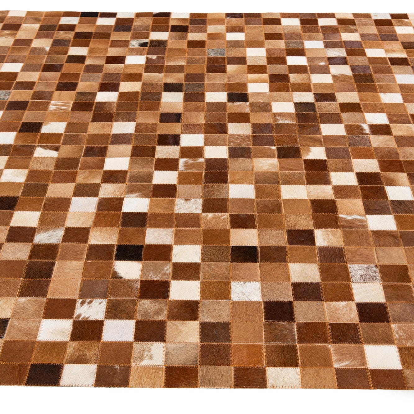Hand made of cowhide and leather, this rug is composed of a tight checkerboard of stitched squares set on a brown background. Patches of brown, light brown, tan, beige and ivory create a warm, rhythmic pattern with occasional marbling where individual hides show natural markings. The surface has a short, soft nap with a subtle sheen where the hair catches the light, and the hand-stitched seams give the piece a tactile, structured feel underfoot.