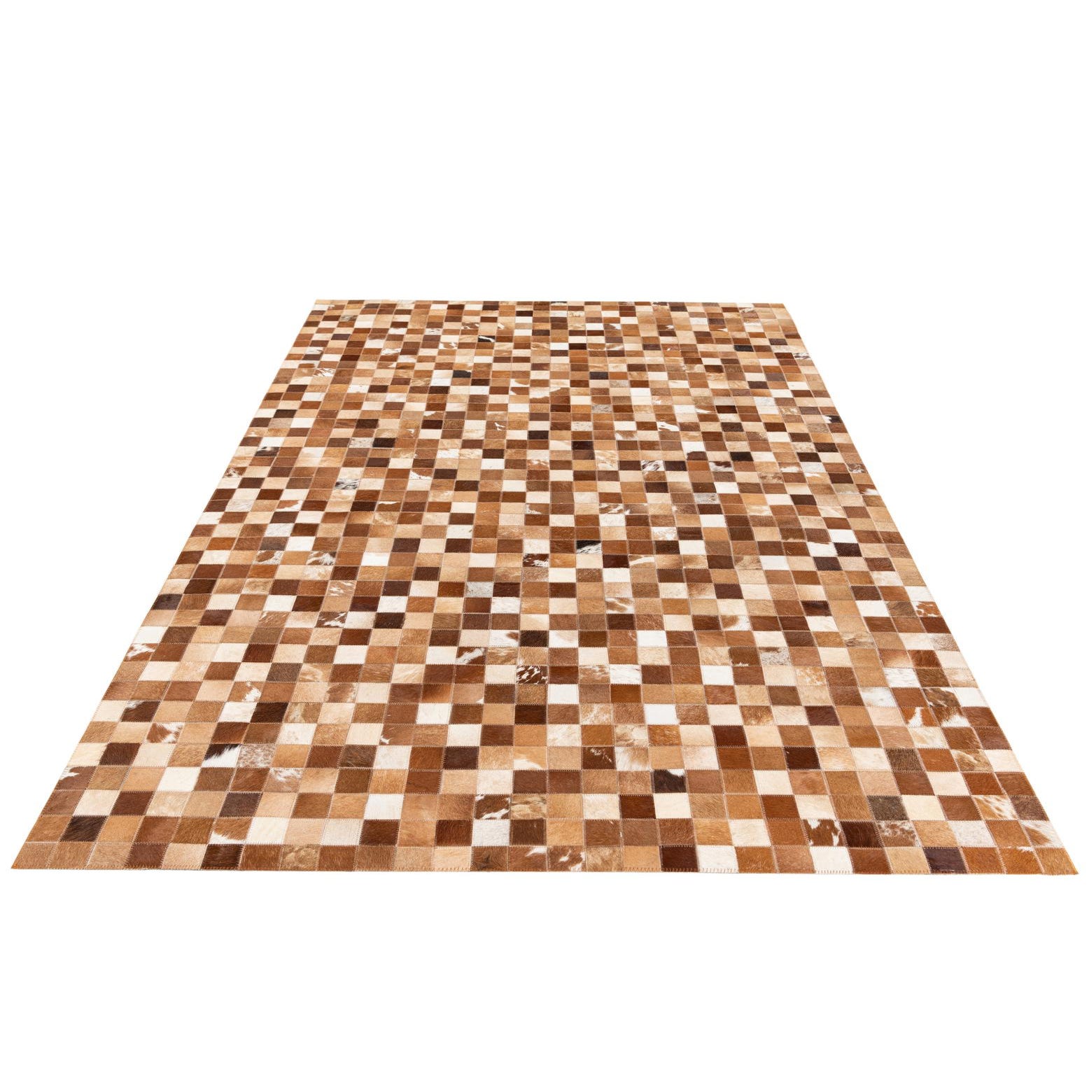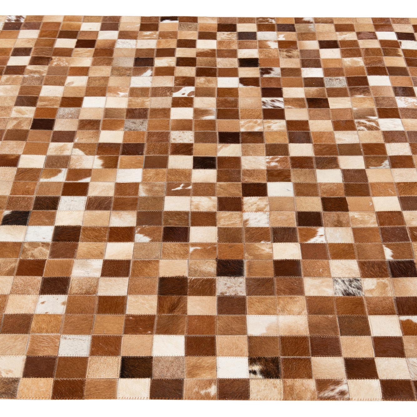 A 5x8 rectangular Cowhide Stocks rug featuring a modern patchwork of brown and tan cowhide squares, suitable for a living room.