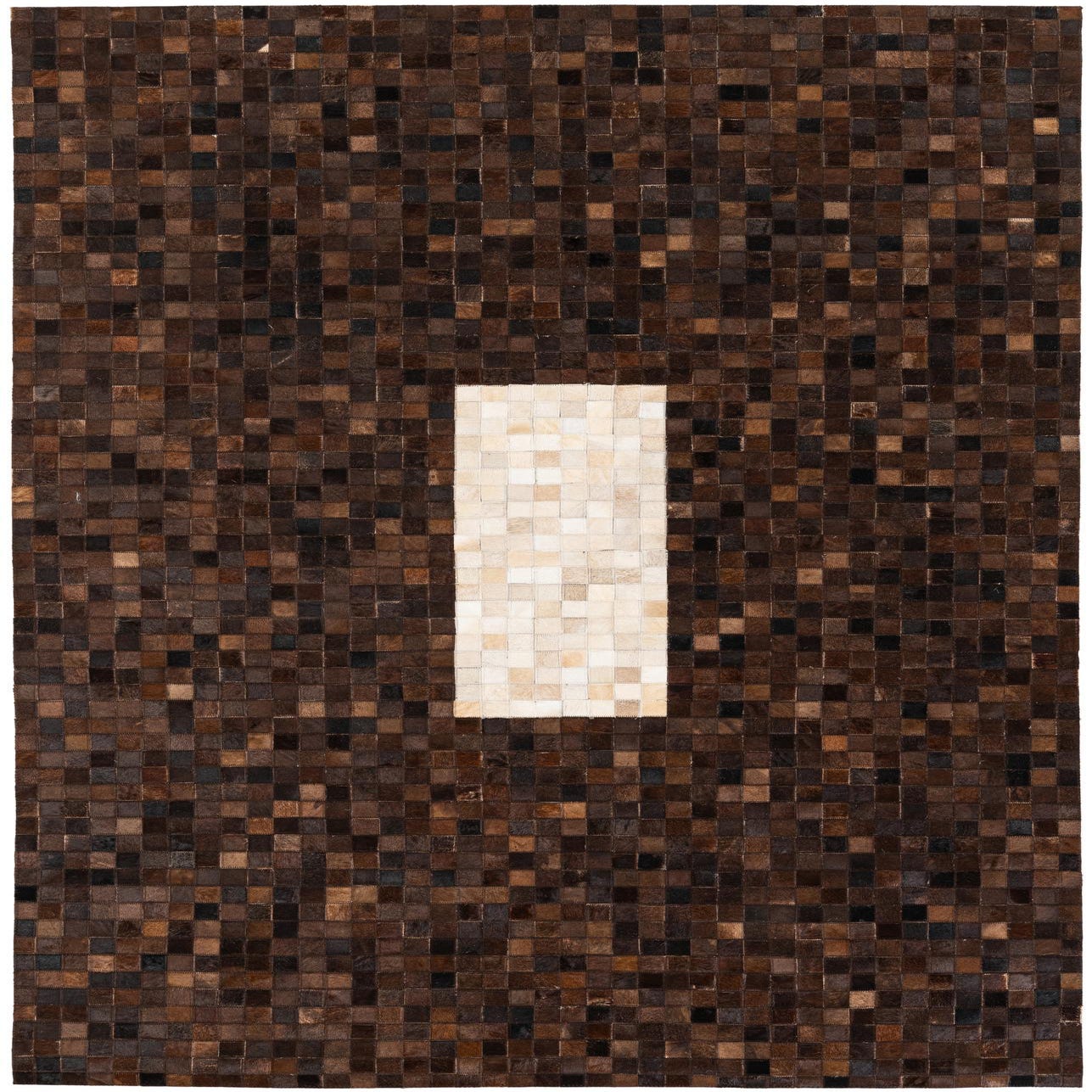 A 5x8 rectangular Cowhide Stocks rug featuring a modern pattern of small brown and tan patchwork squares with a central white rectangular block.