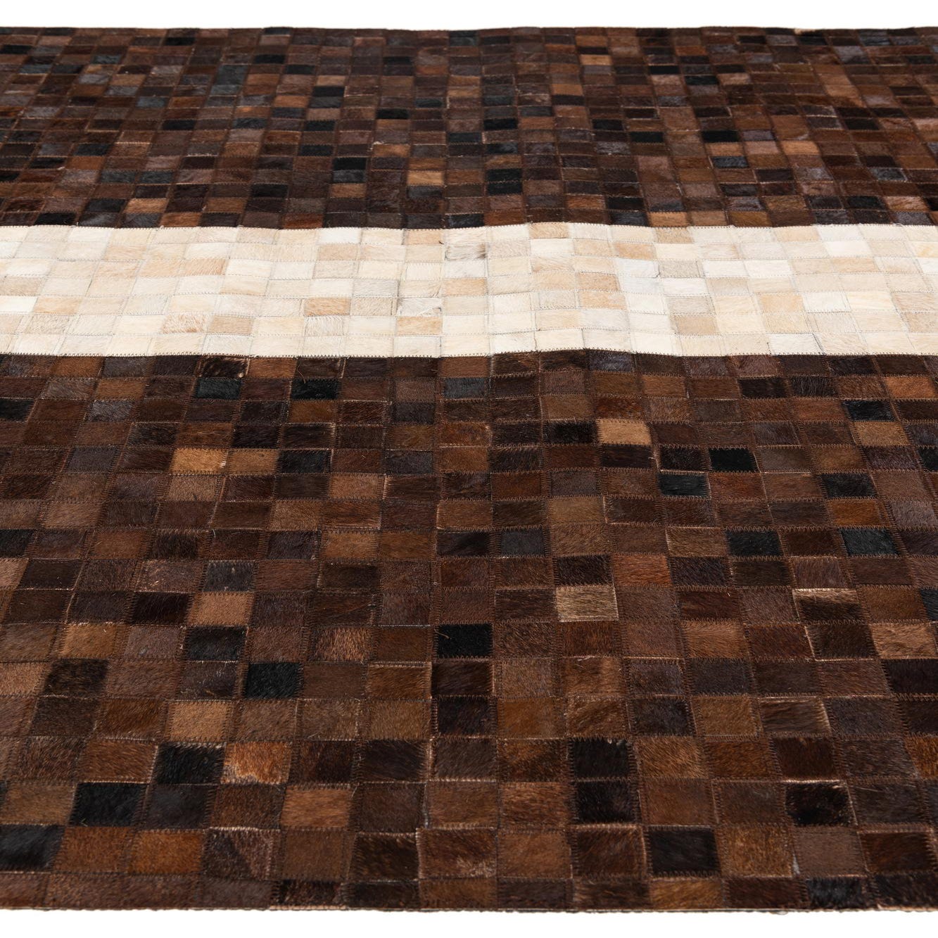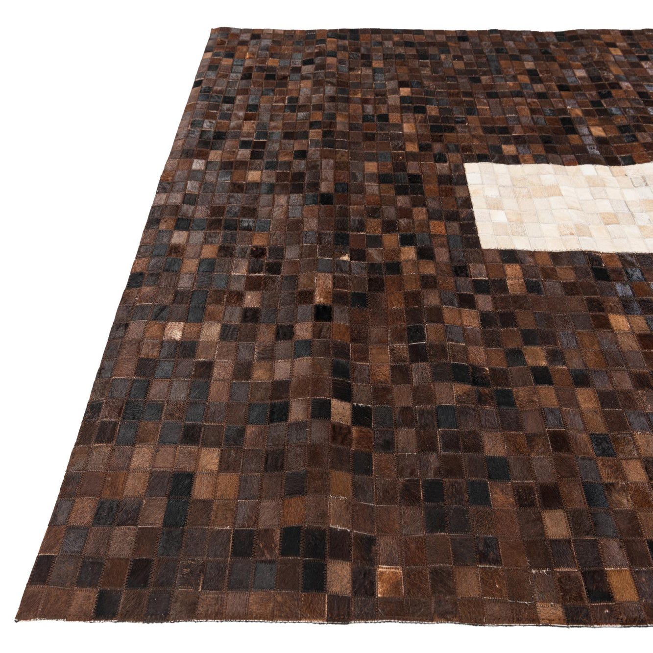 A 5x8 rectangular Cowhide Stocks rug featuring a modern pattern of small brown and tan squares with a central vertical white rectangular block.