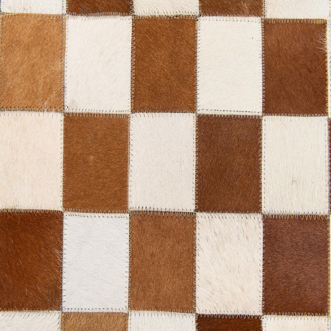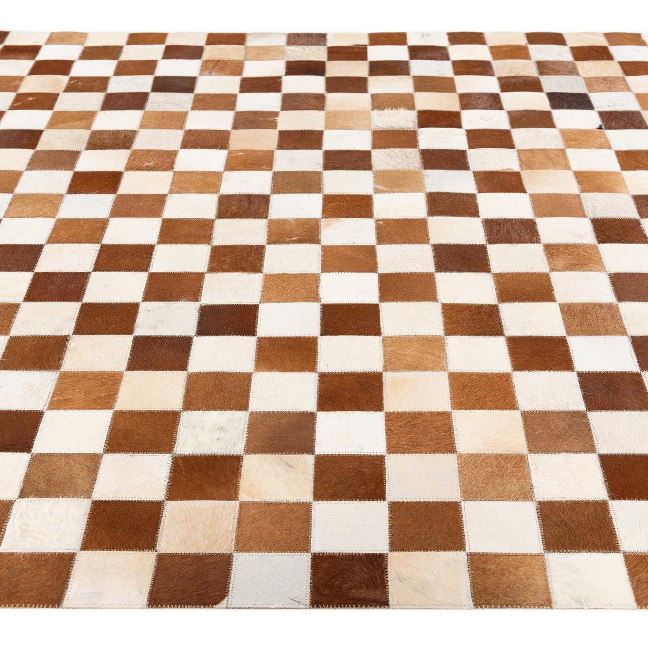 A 5x8 rectangular Cowhide Stocks rug featuring a modern checkerboard pattern in varying shades of brown and tan.