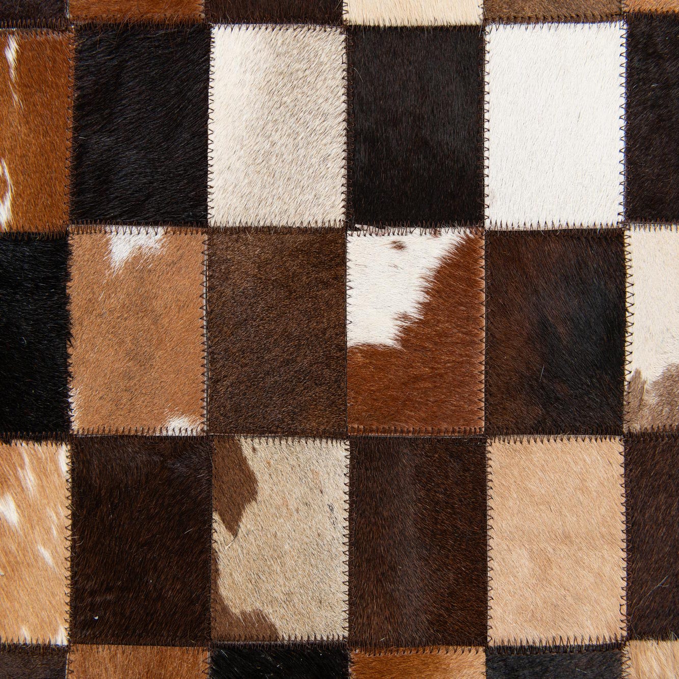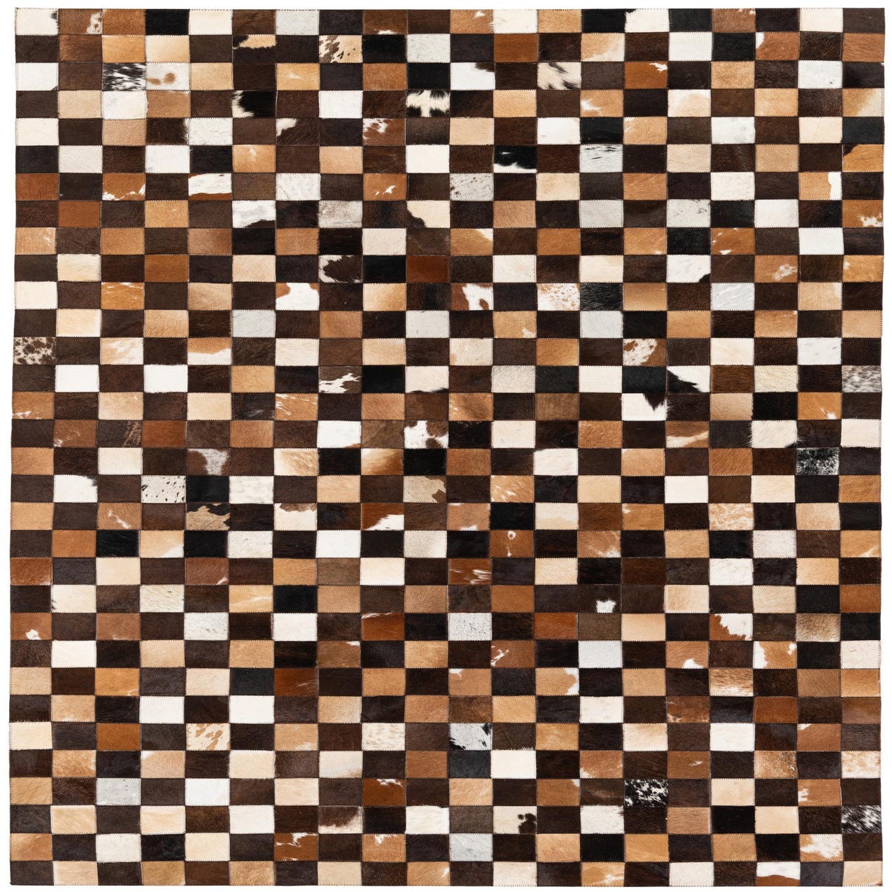 A 5x8 rectangular Cowhide Stocks rug featuring a modern checkerboard pattern in various shades of brown, tan, and white.