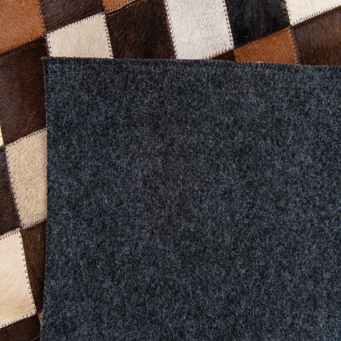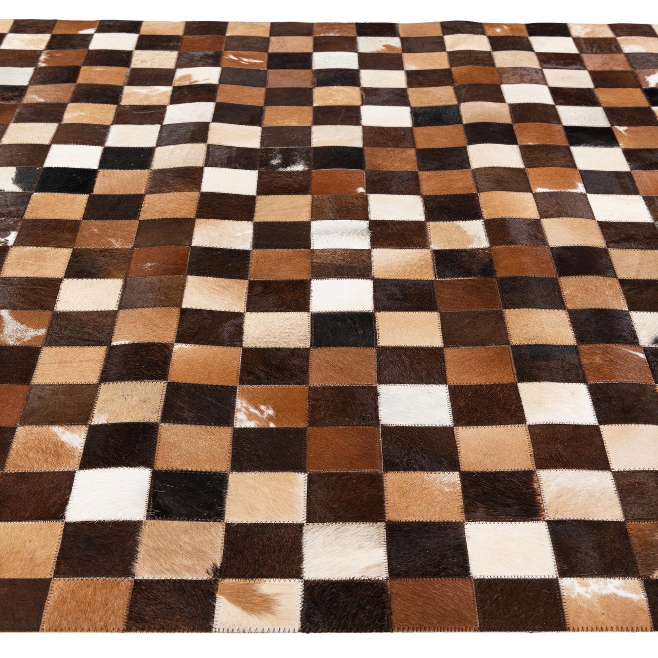 A rectangular 5x8 modern cowhide rug featuring a checkerboard pattern of brown, tan, and white patches.