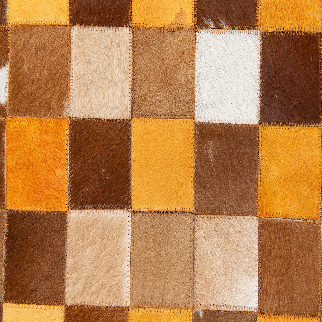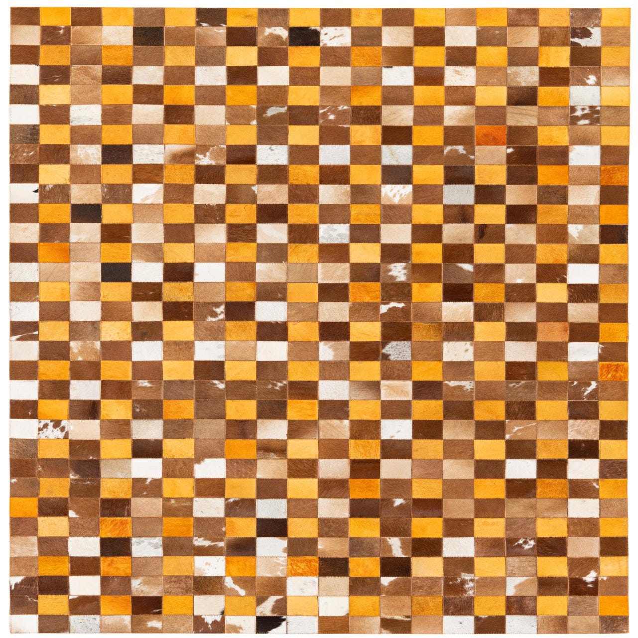 A 5x8 rectangular Cowhide Stocks rug from Rugs.com, featuring a modern patchwork of brown, tan, and white cowhide squares.