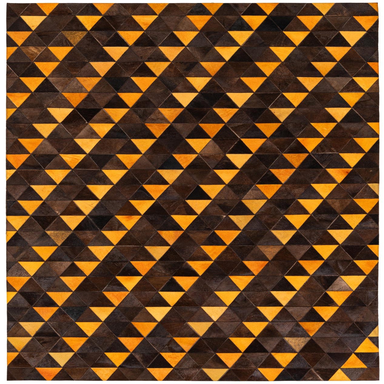 A 5x8 rectangular Cowhide Stocks rug featuring a modern geometric pattern of alternating brown and tan triangles.
