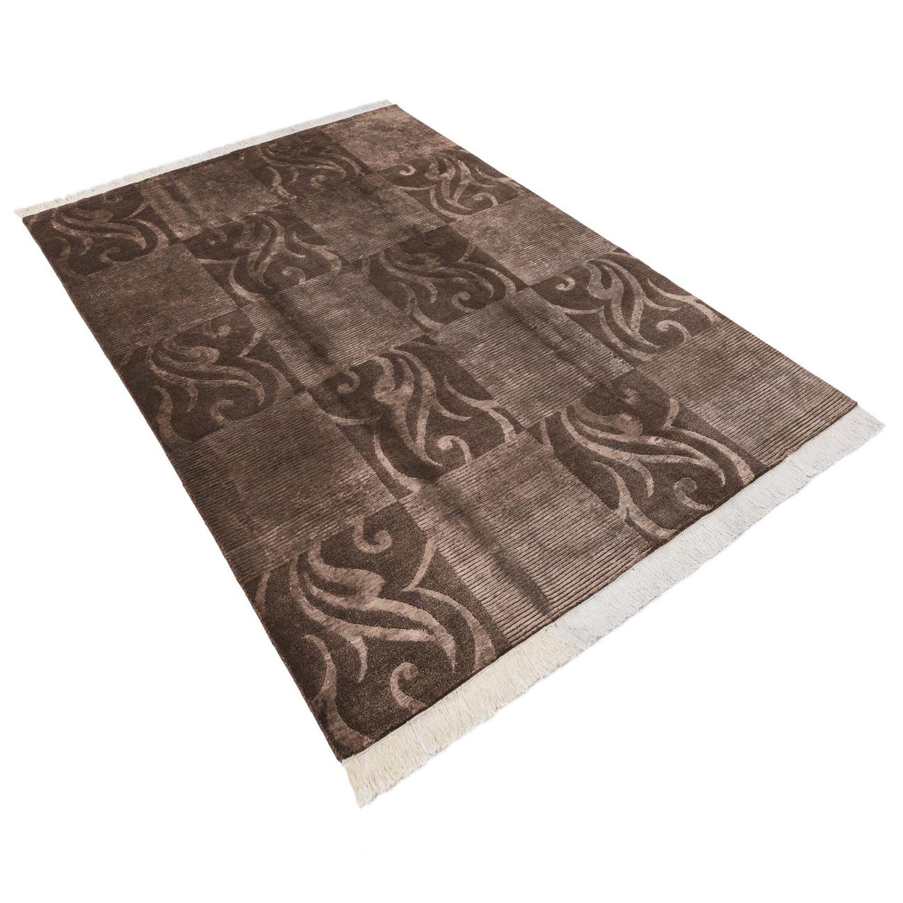 A 5x8 rectangular Darya rug with a modern Persian pattern in varying shades of brown and tan, featuring alternating blocks of striped and ornate floral designs, with white fringe.