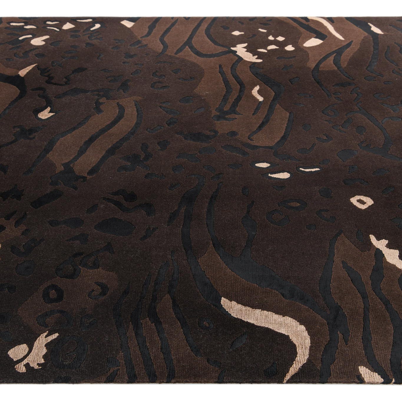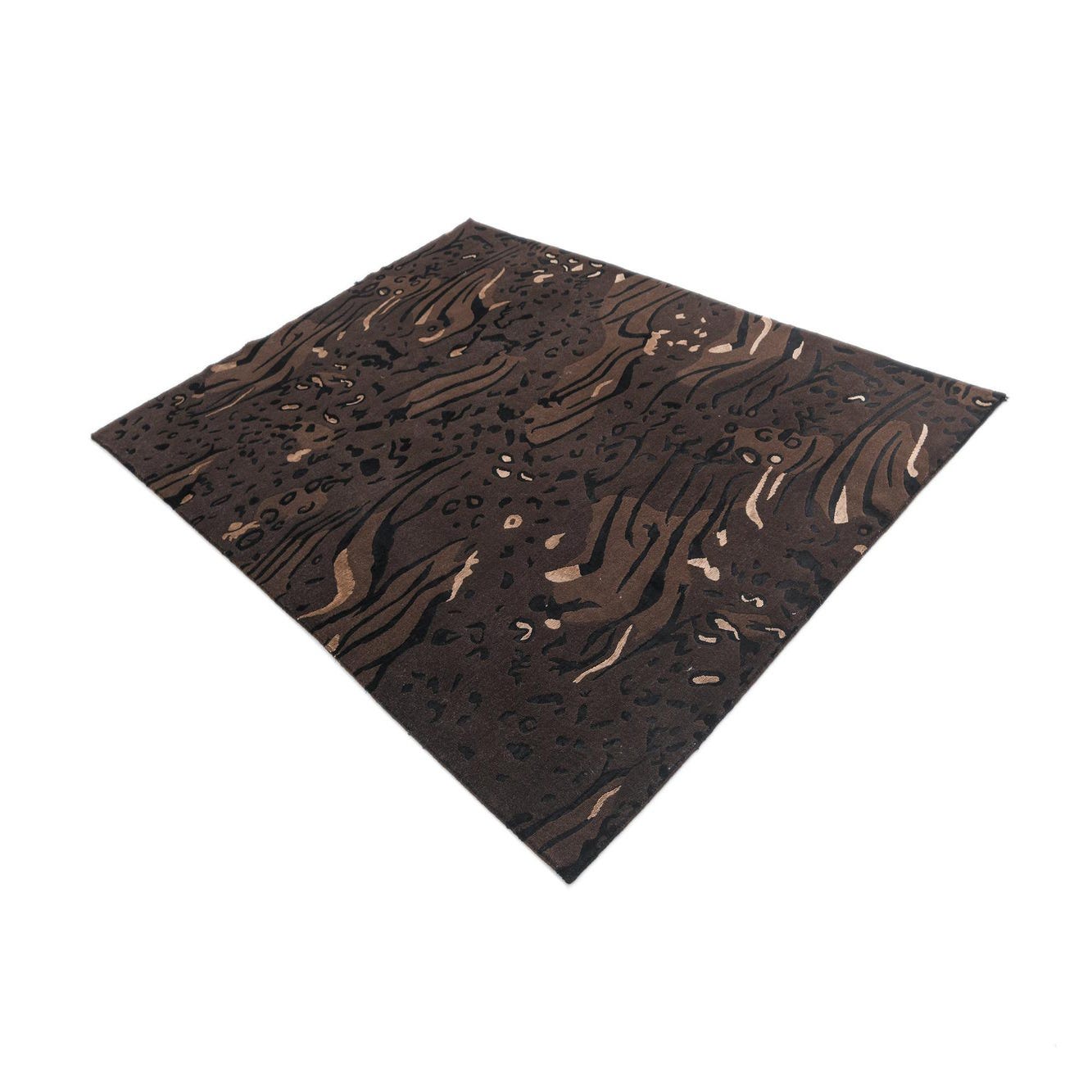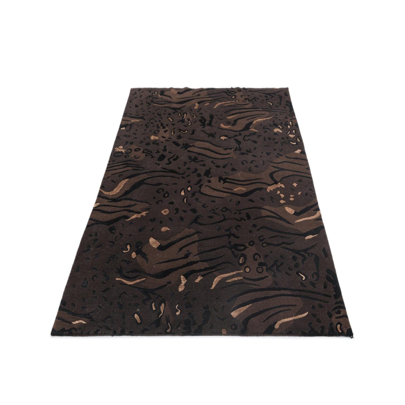The Darya Collection offers a handcrafted wool and cotton 5x8 rug that presents a sophisticated tapestry of organic and abstract shapes. This piece showcases a rich brown background, complemented by accents in shades of black, light brown, and tan. The rug's intricate patterning adds visual depth, while the high-quality materials ensure a plush, comfortable underfoot feel.