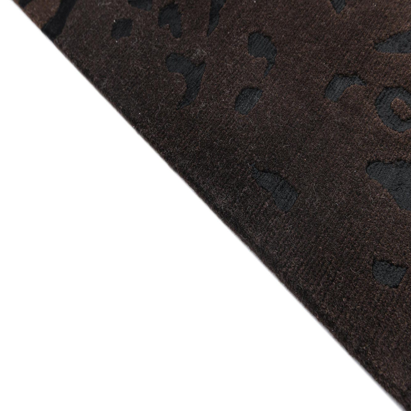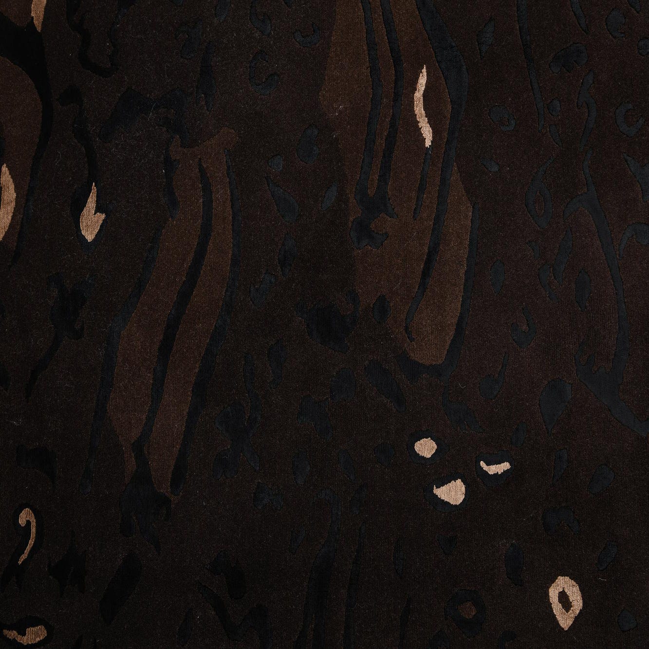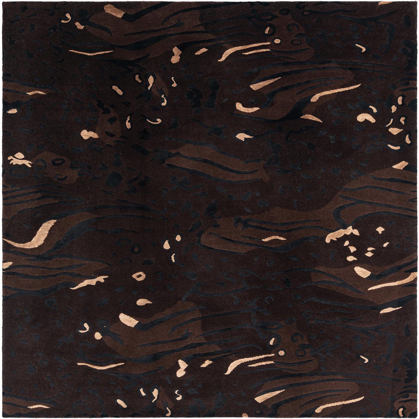 The Darya Collection offers a handcrafted wool and cotton 5x8 rug that presents a sophisticated tapestry of organic and abstract shapes. This piece showcases a rich brown background, complemented by accents in shades of black, light brown, and tan. The rug's intricate patterning adds visual depth, while the high-quality materials ensure a plush, comfortable underfoot feel.