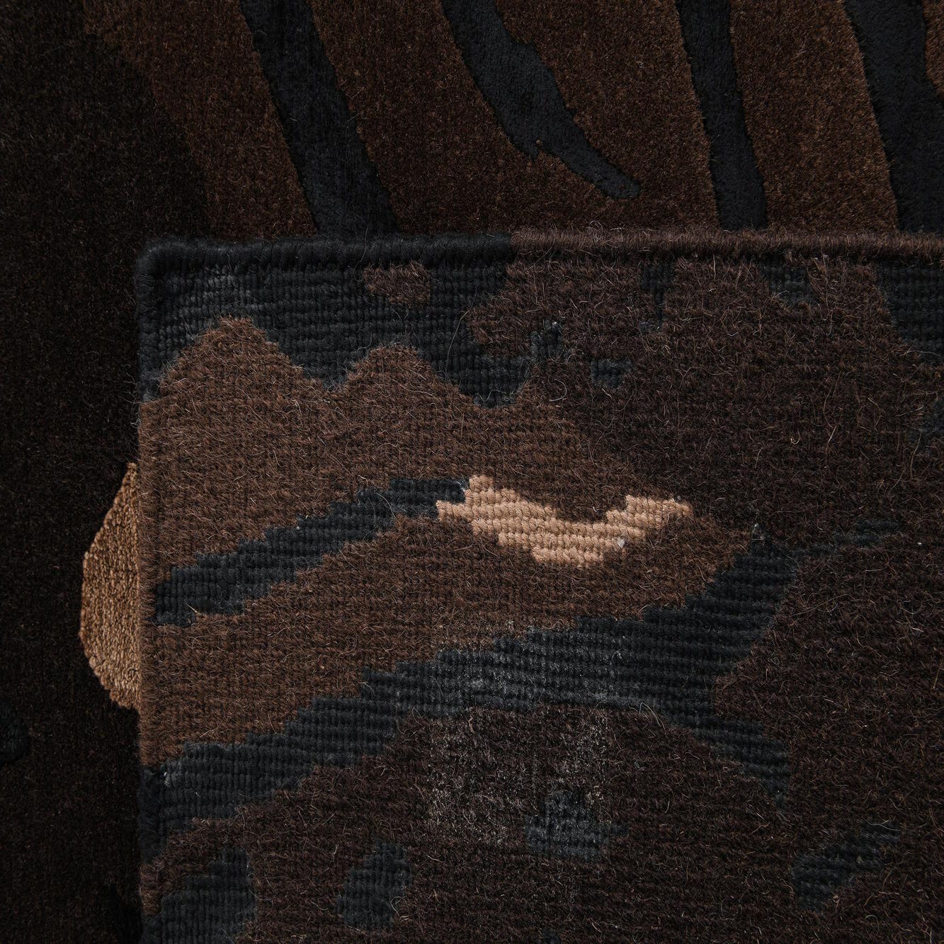 Primary color is Brown. Colors in this rug include: Brown, Black, Light Brown, Tan.