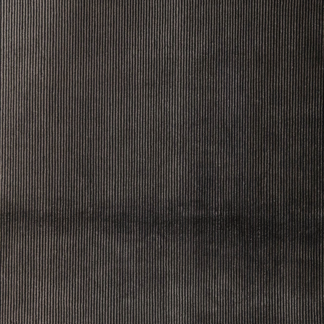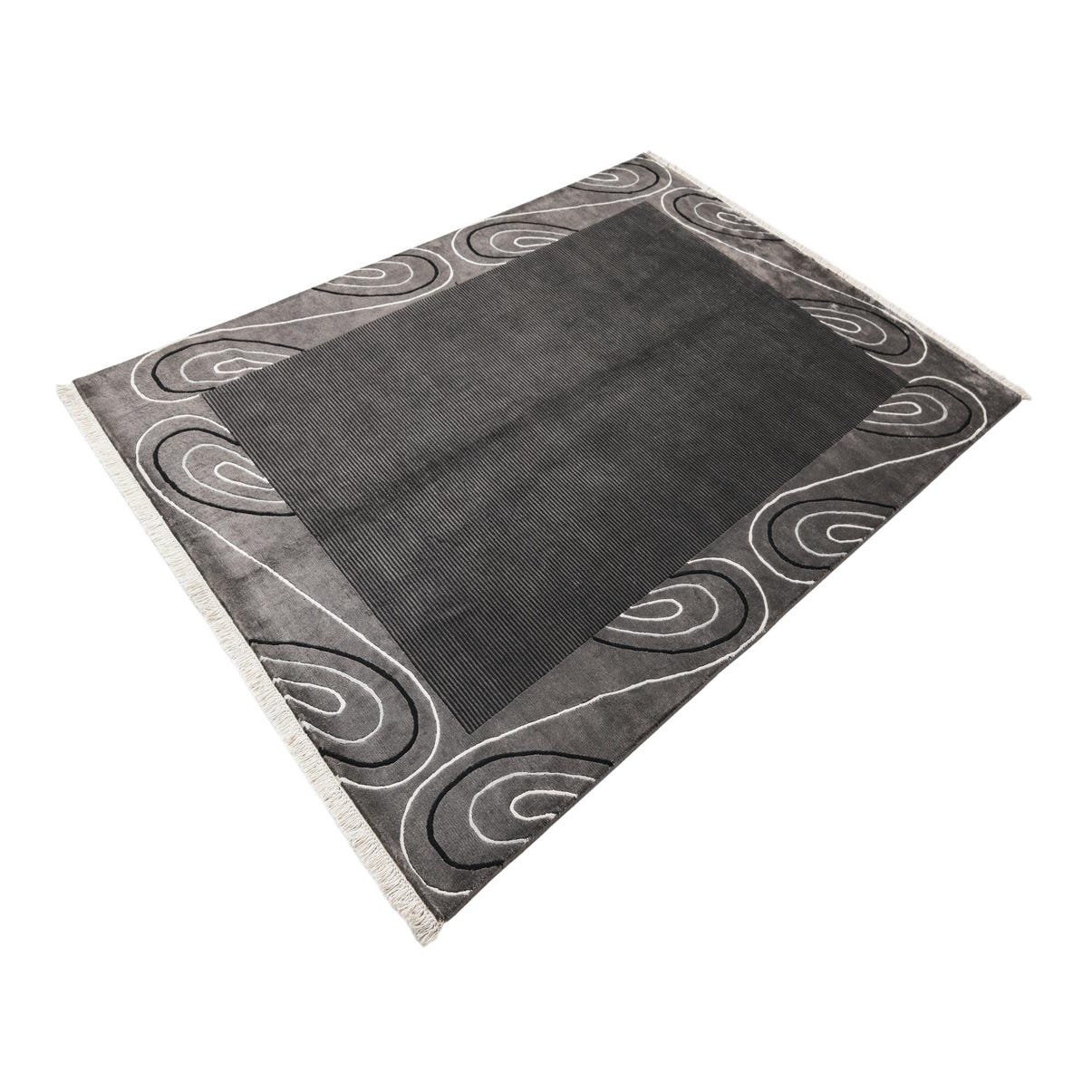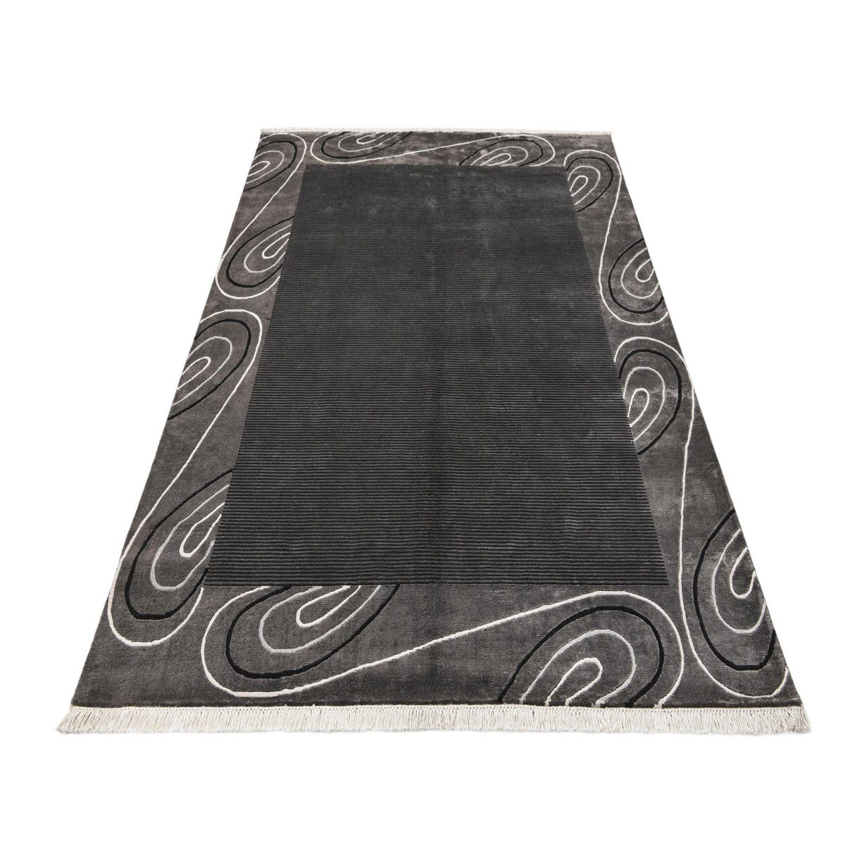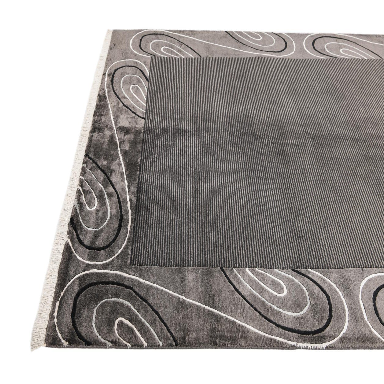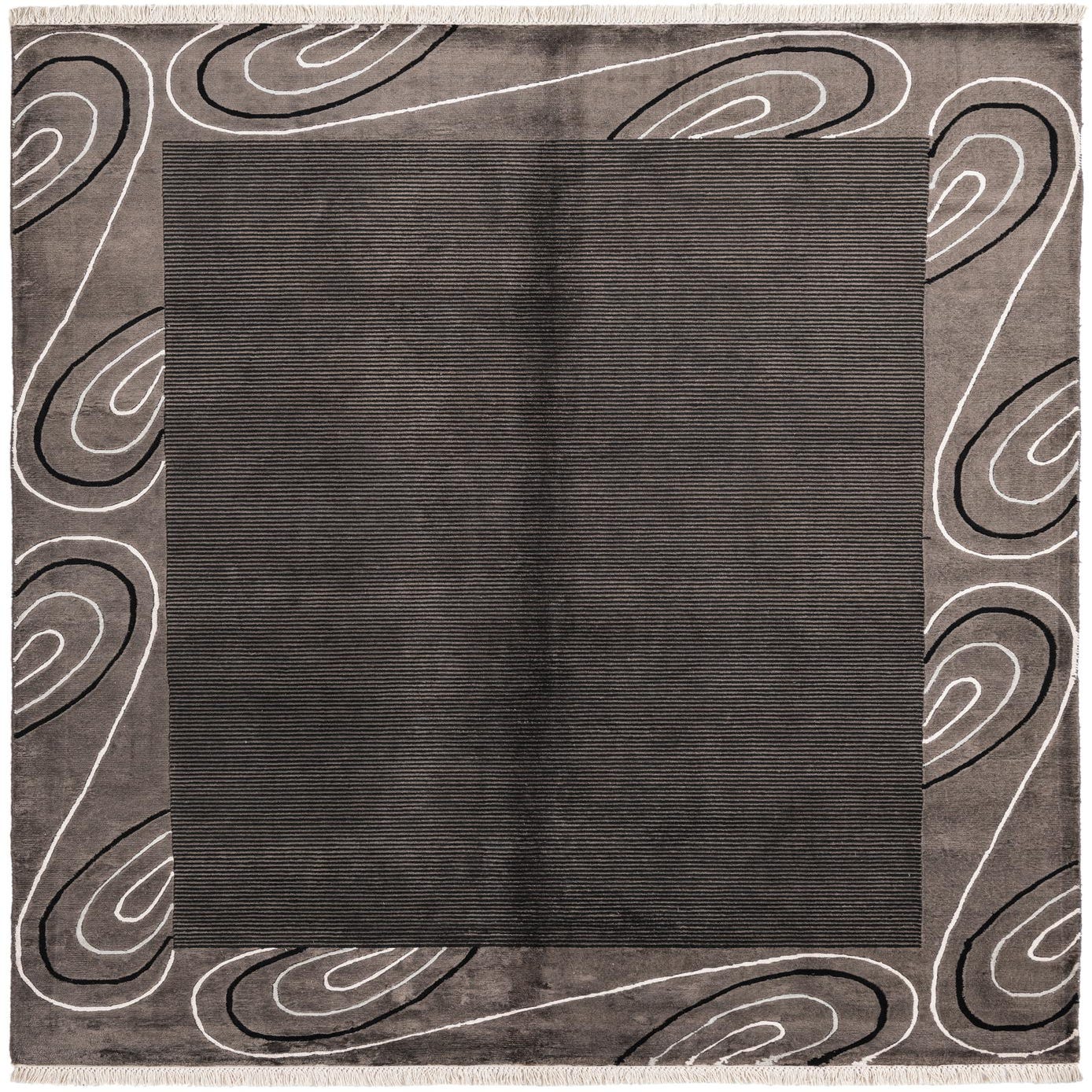 A modern-border rug grounded by a warm brown background, this hand-knotted piece in 100% wool combines a finely ribbed central field with a smooth, sculpted border of abstract teardrop swirls. The center’s closely set horizontal ribs create a subtle linear texture you can feel underfoot, while the border’s black and beige outlines add crisp contrast and visual movement. Short fringe on the ends and the dense wool pile give the rug a soft, tactile presence and a gentle sheen that catches light without overpowering the room.