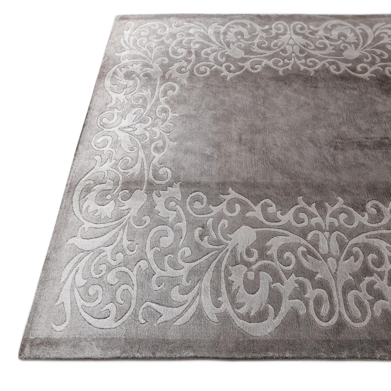 The Darya Collection rug is a gracefully hand-knotted piece, crafted from 100% wool and sized at a versatile 5x8. It boasts a sophisticated pattern featuring ornate scrollwork in light brown and silver tones that stand out against the rich brown background. The design nods to classic motifs while maintaining a modern simplicity that allows for versatility in various interior design settings.