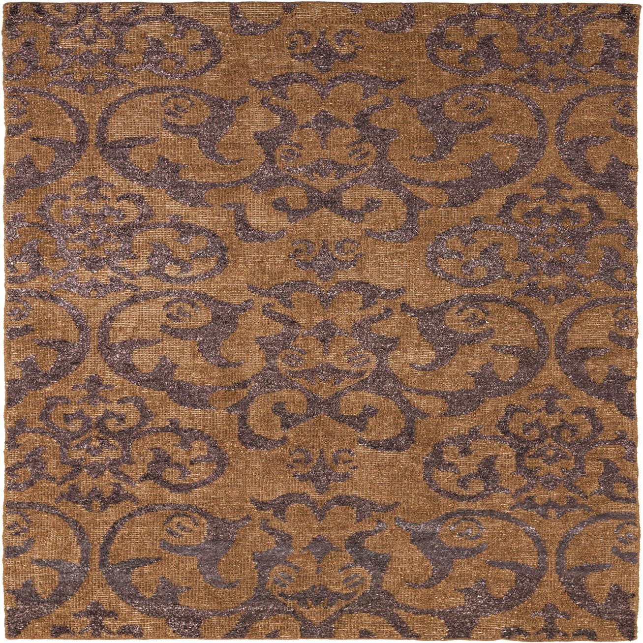 Hand-knotted of wool and silk, the surface combines wool’s warm, tactile feel with silk’s subtle sheen, so the purple pattern catches light and adds dimensionality against the matte brown background. Place this rug beneath a living-room seating group to anchor warm-wood furniture and leather pieces, layer it under a dining table in a formal or transitional dining room, or use it in a study or bedroom to introduce pattern and depth without overwhelming the palette.