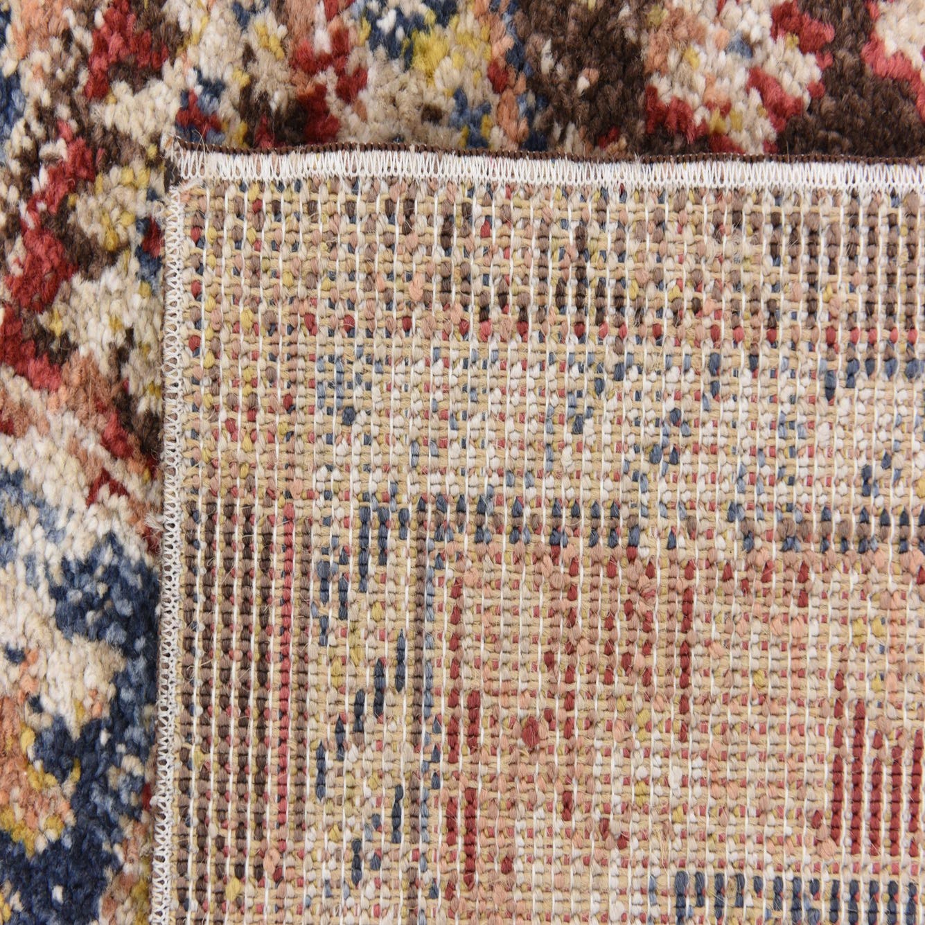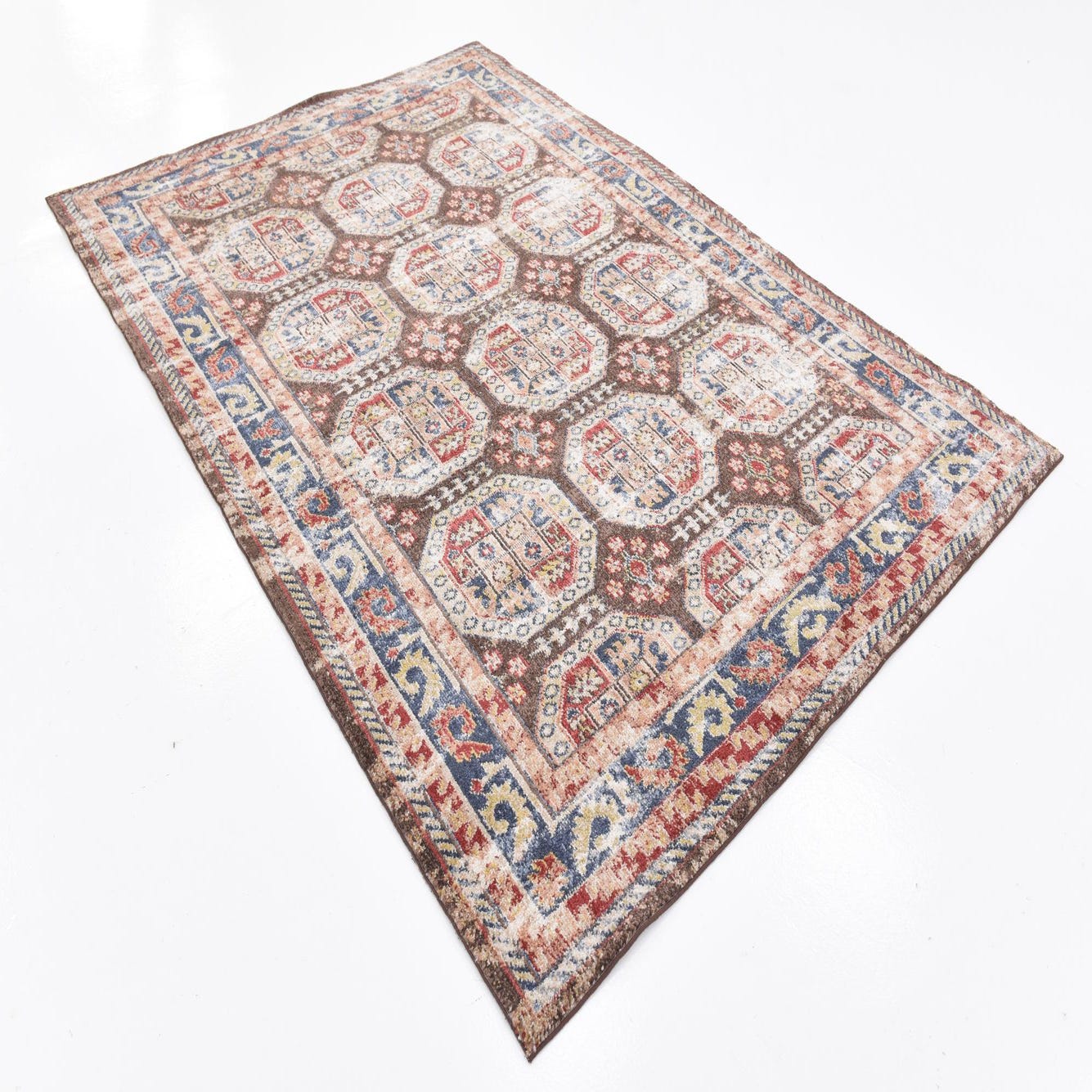 Primary color is Brown. Colors in this rug include: Brown, Beige, Blue, Red, Navy Blue, Tan.