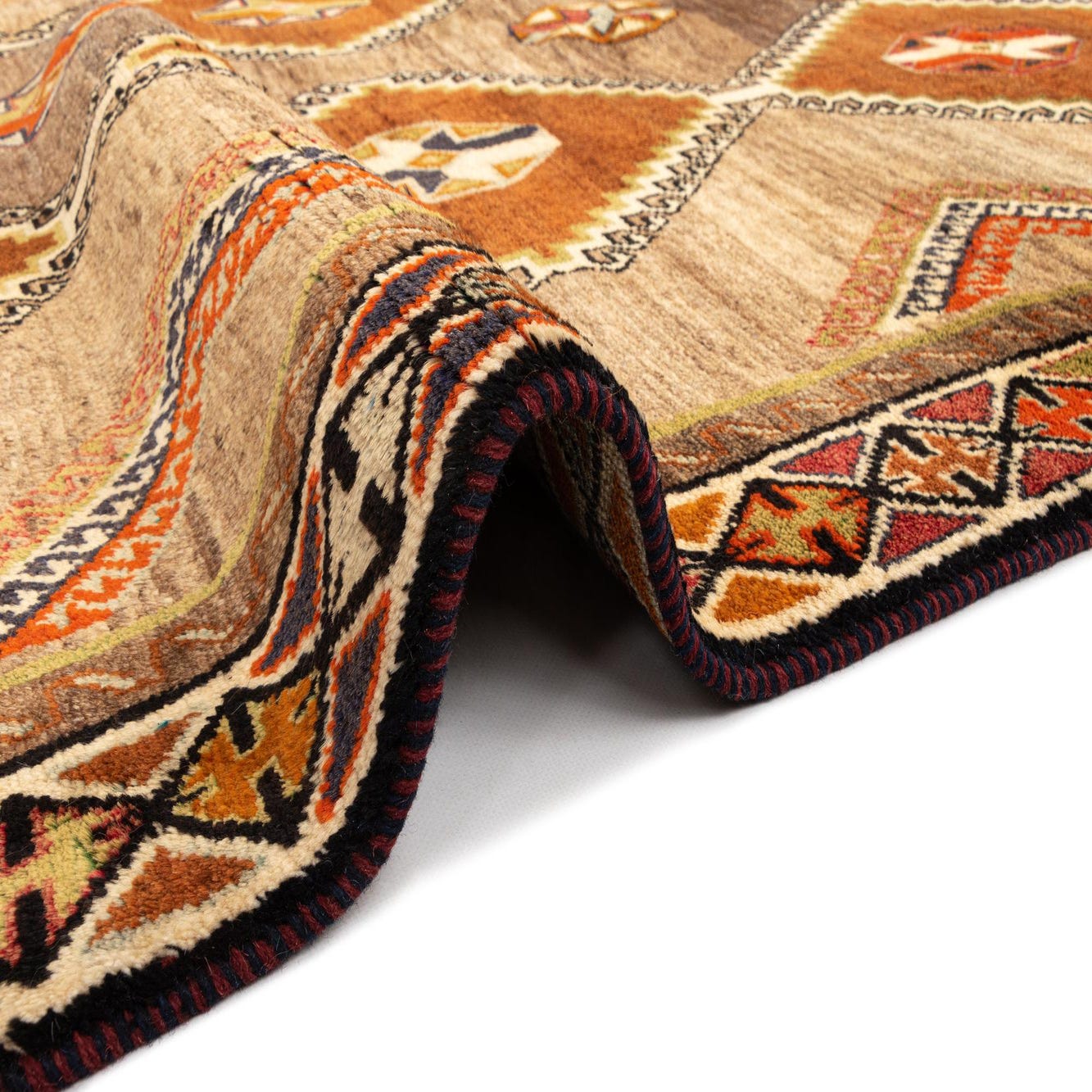This Gabbeh collection rug is handcrafted from 100% wool, offering a durable and comfortable texture. The size of this piece is 5x8, making it versatile for a variety of interior spaces. The design features a geometric pattern with diamond shapes in rich shades of brown and orange, accented with cream, grey, green, and red details. The symmetrical arrangement of motifs is bordered by intricate tribal patterns, contributing to its traditional aesthetic.