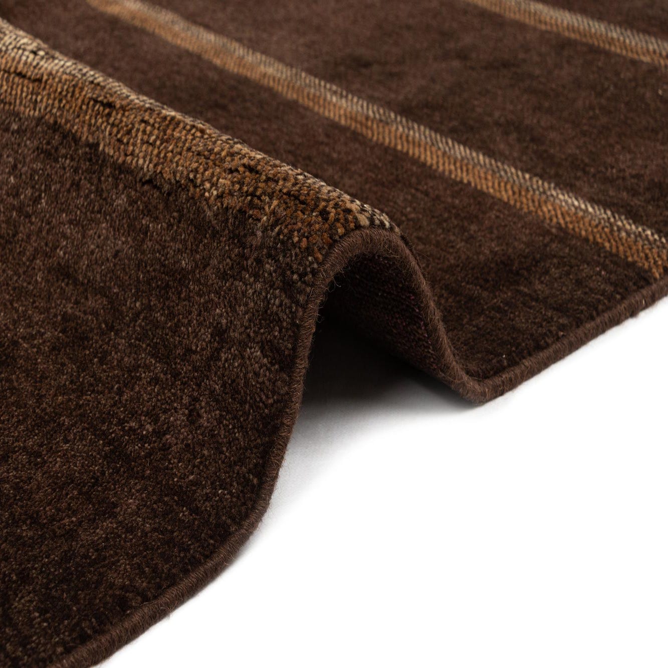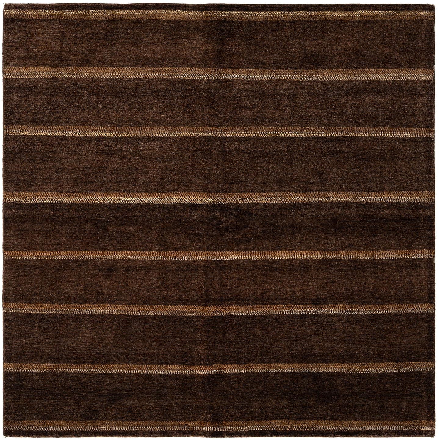 A 5x8 rectangular Juma Persian rug in rich brown with subtle tan horizontal stripes, made of wool.