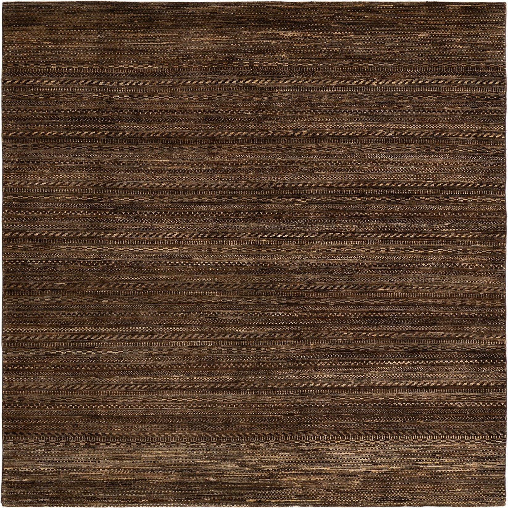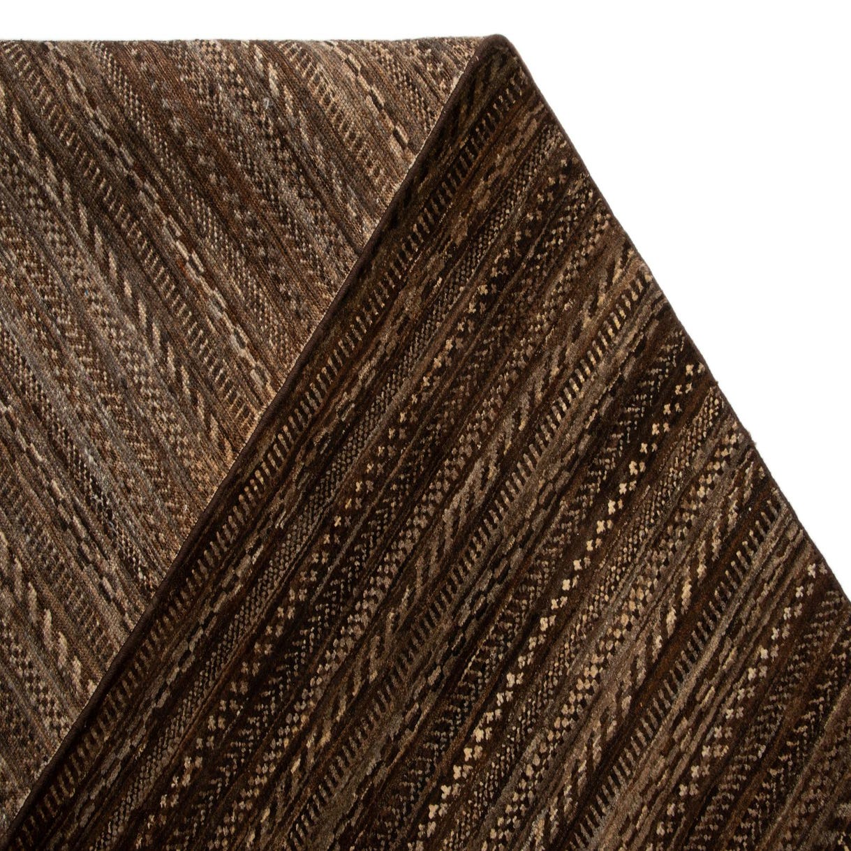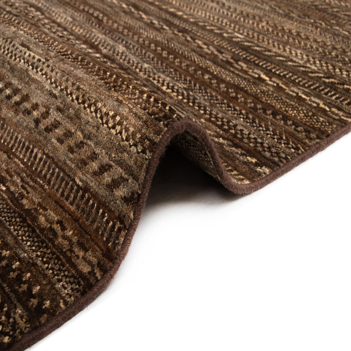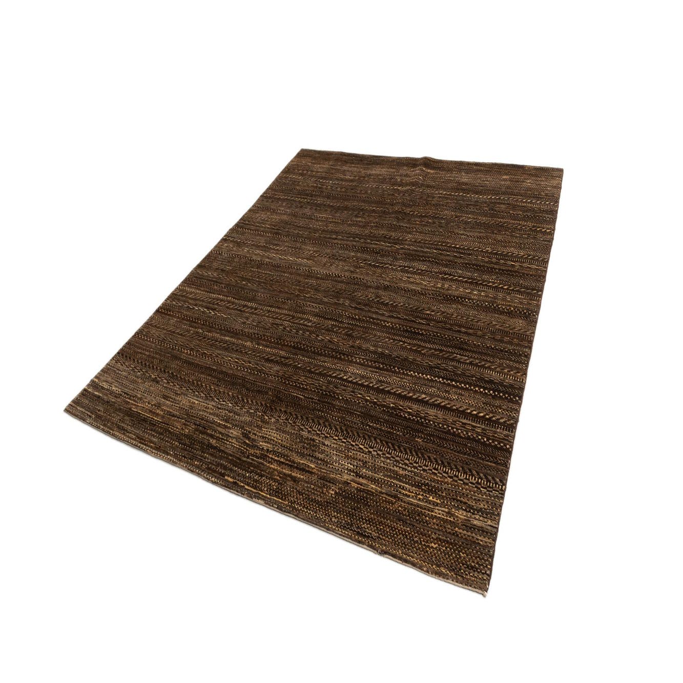 A 5x8 rectangular Juma Persian rug in varying shades of brown and tan, featuring horizontal striped patterns.