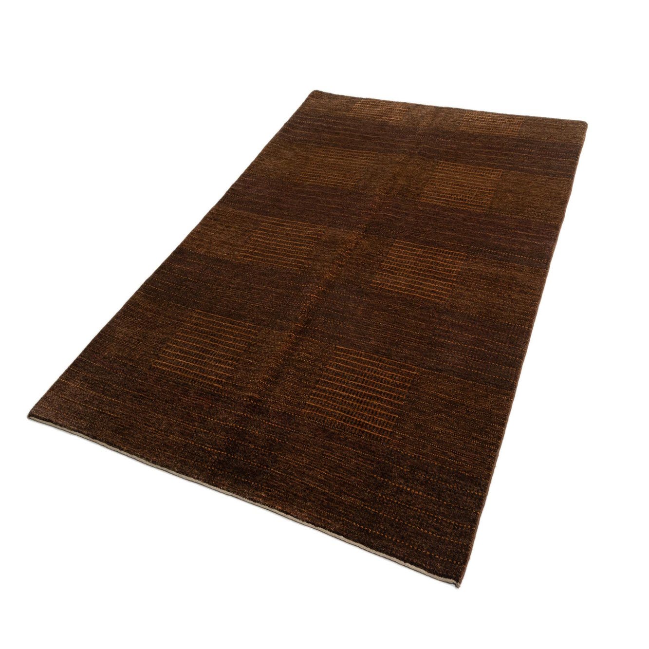 The Juma Collection offers a 5x8 hand-made rug crafted from 100% wool, presenting a combination of durability and sophisticated design. This particular rug features a rich brown background with a subtle pattern composed of darker and lighter brown hues, accented with touches of orange and beige. The understated geometric squares pattern provides a sense of structure and modernity.