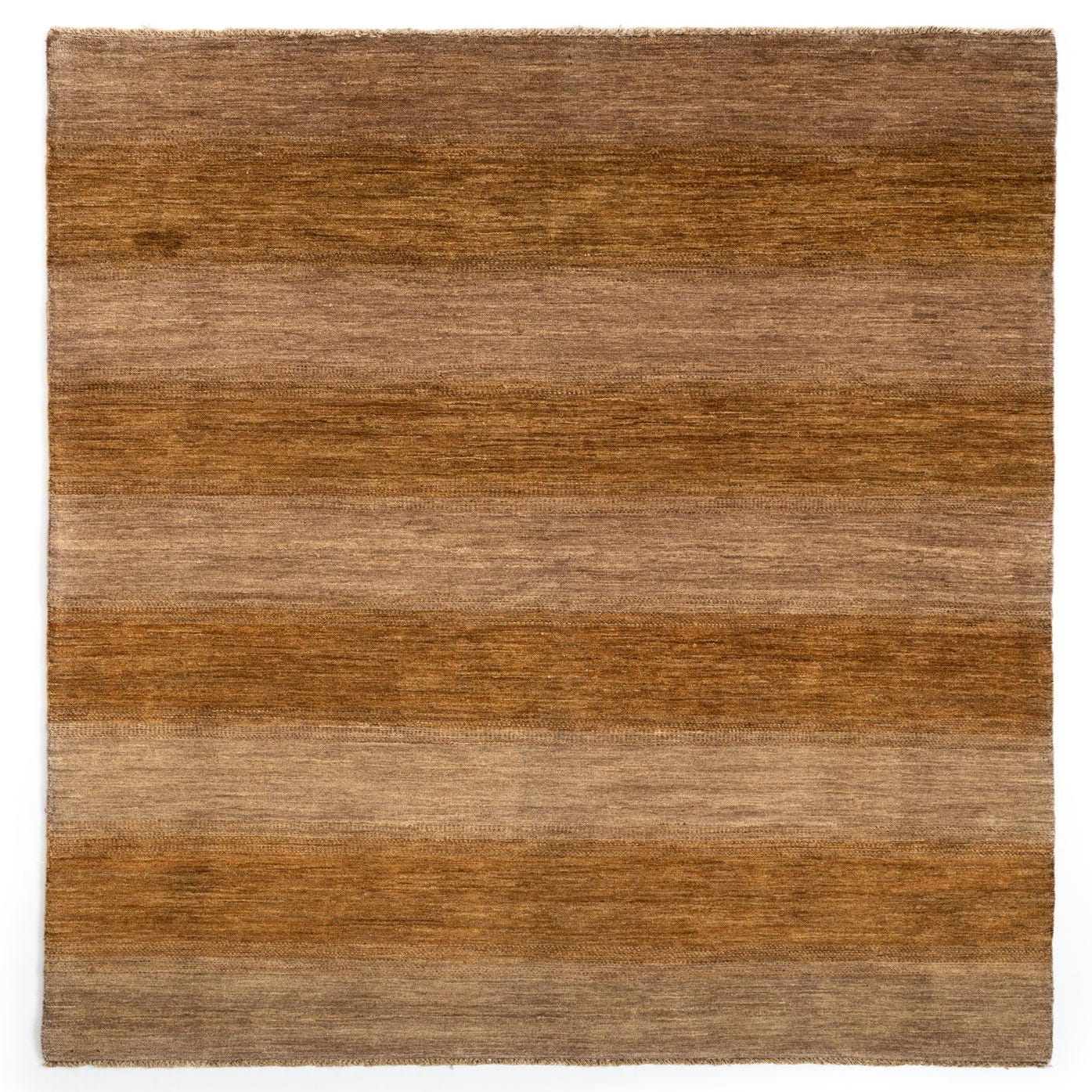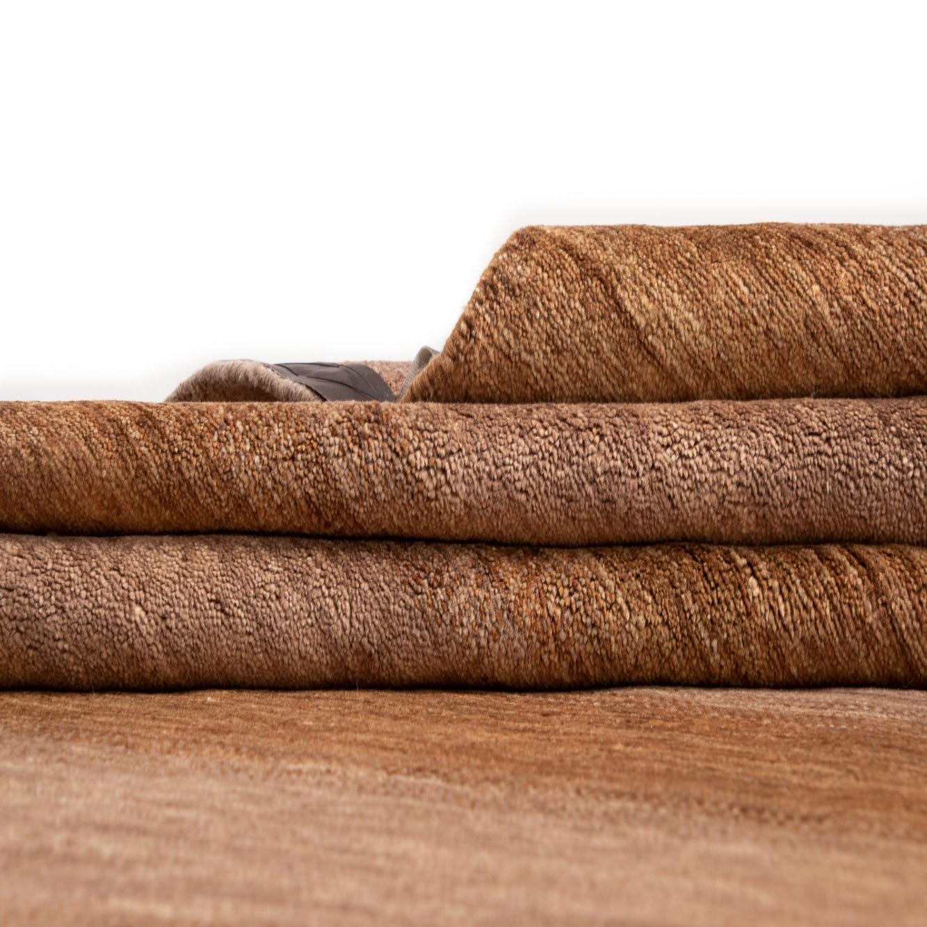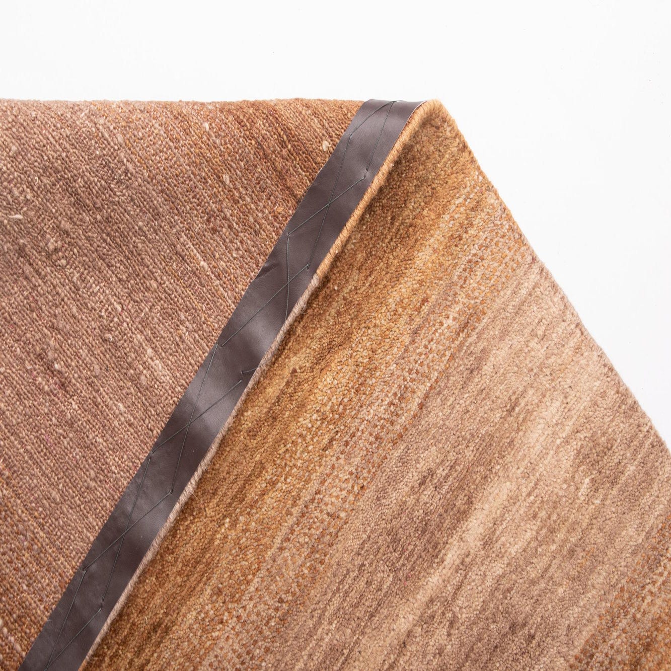 Handmade from 100% wool, this rug shows broad, horizontal bands of warm brown with subtle olive-green threads woven through for depth. The brown background anchors the design while alternating lighter and deeper brown stripes create a calm, linear rhythm across the surface. Running your hand over the pile reveals a soft, dense wool texture with a slight, hand-woven nap that catches the light and emphasizes the rug’s tonal variations.