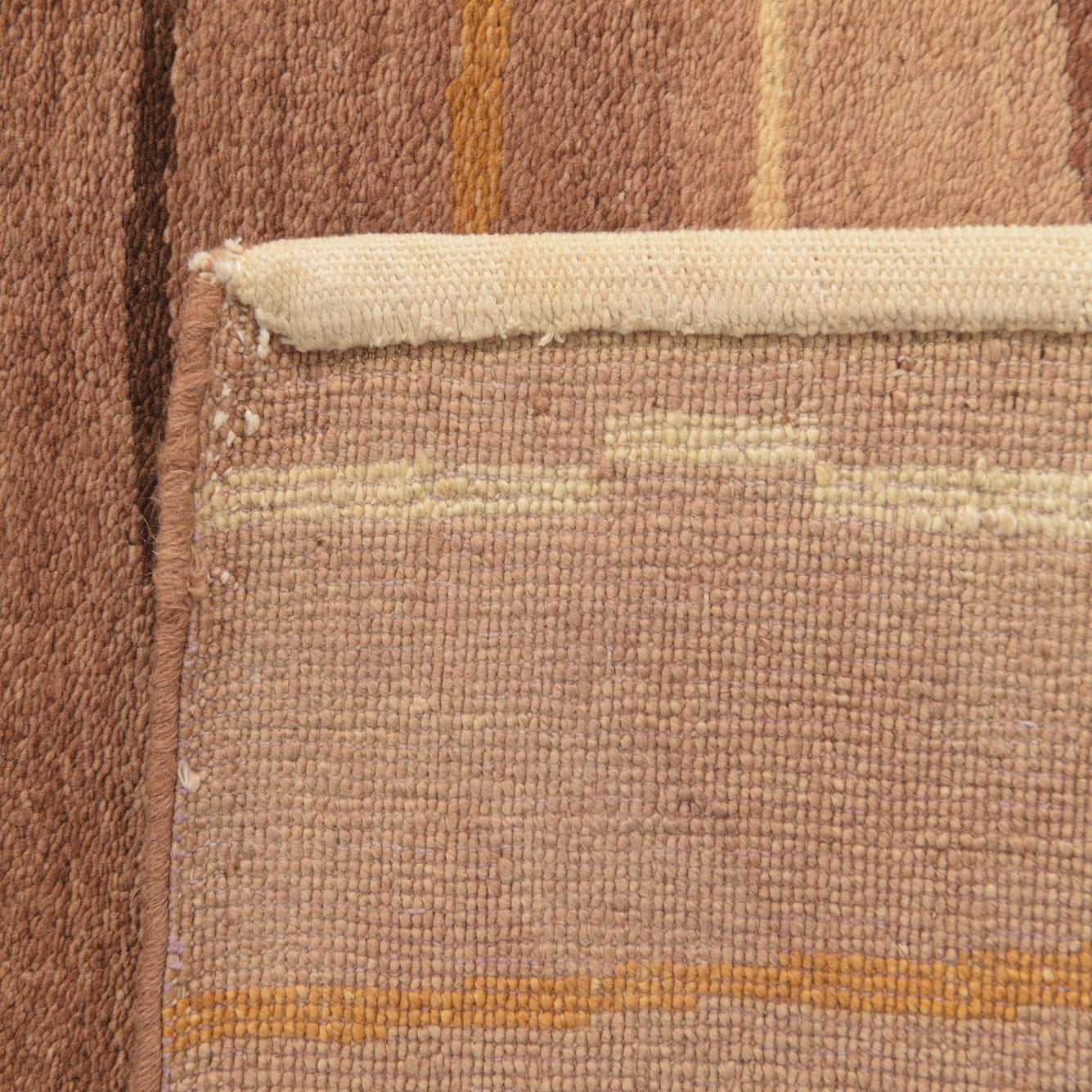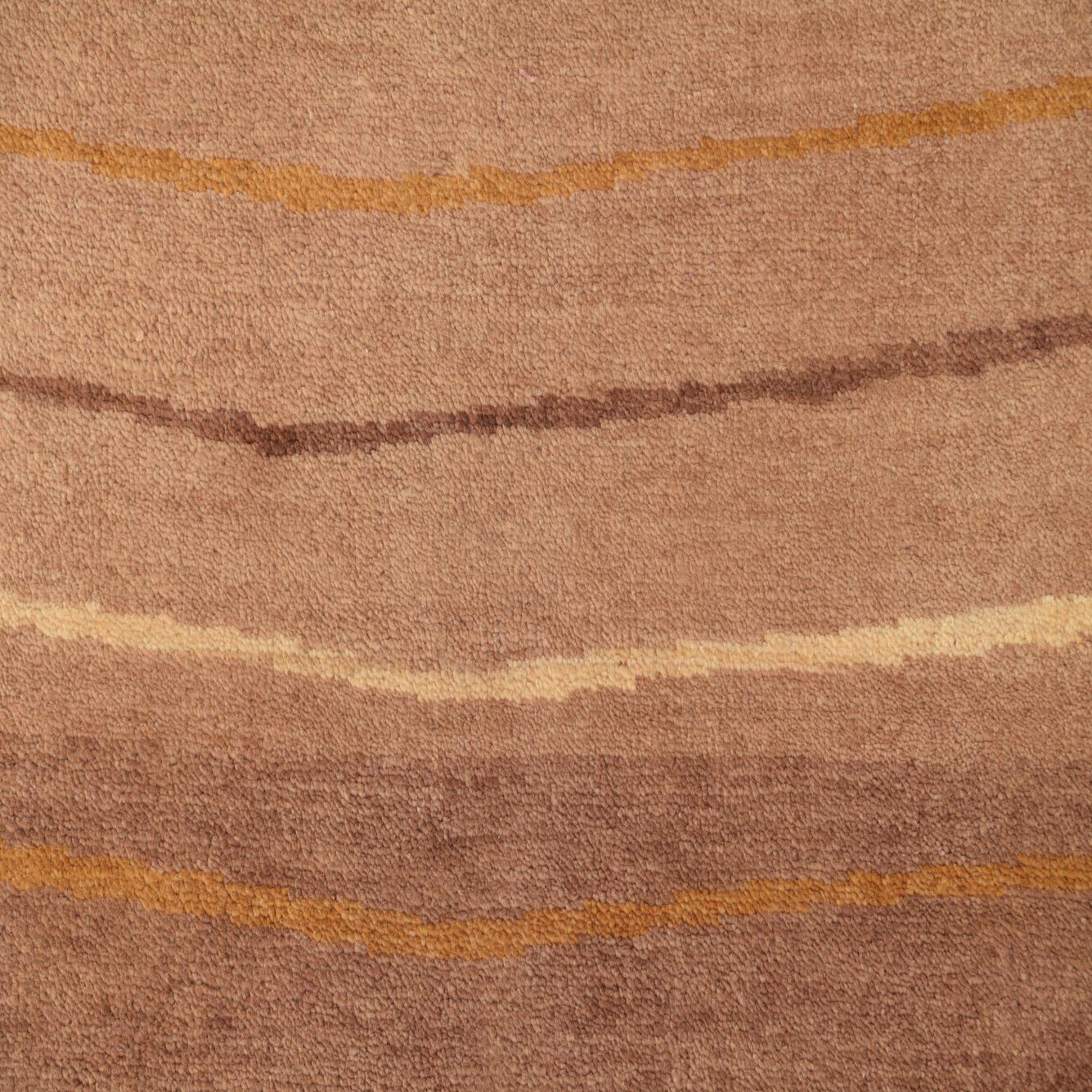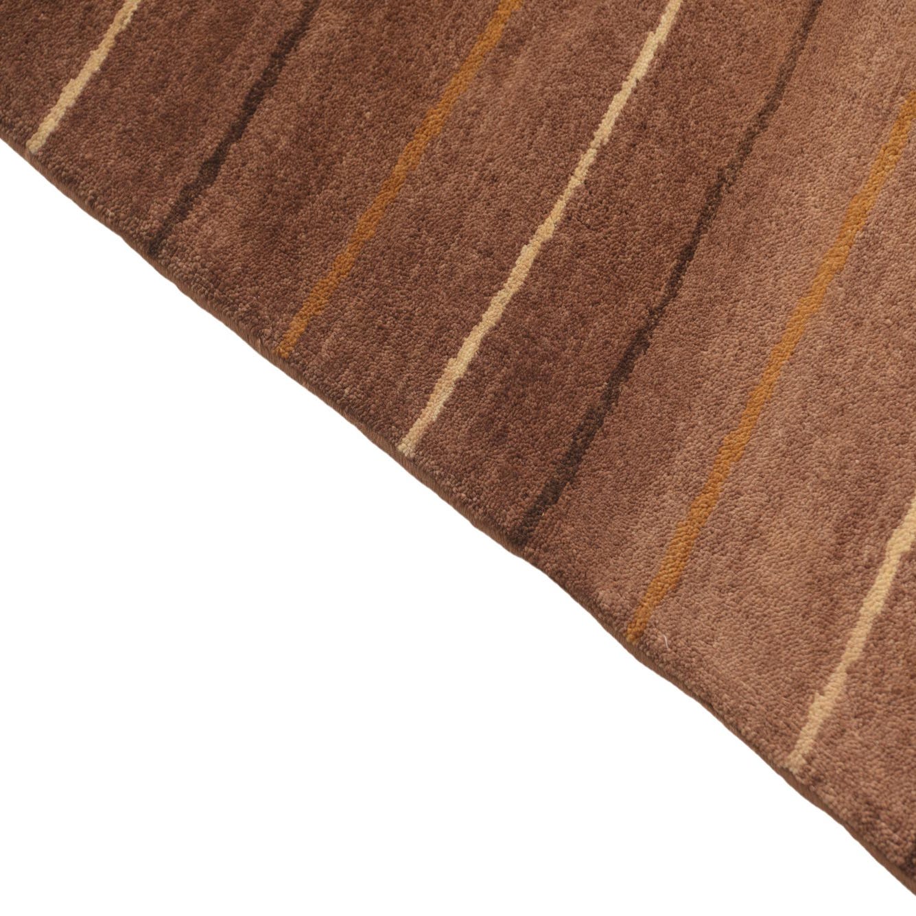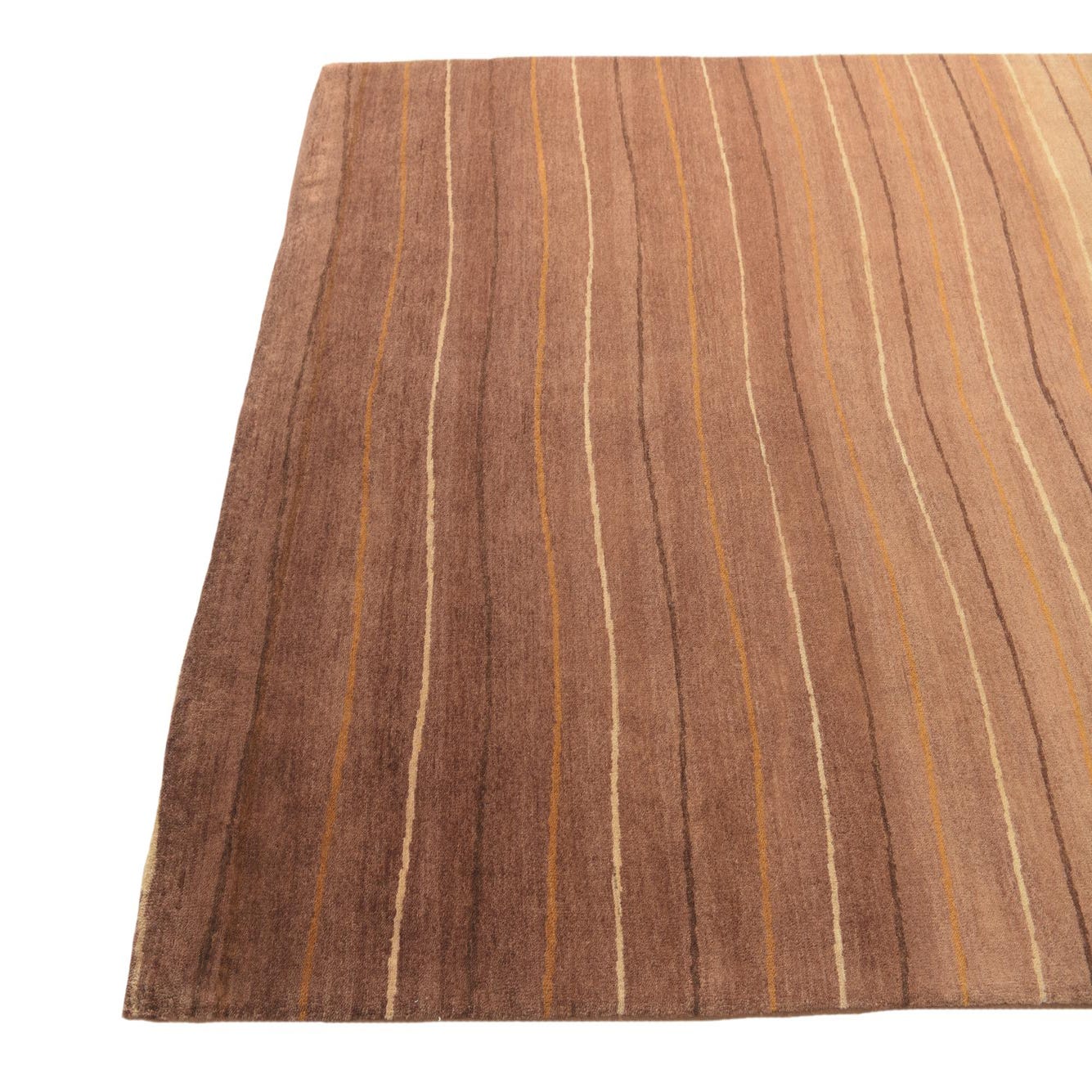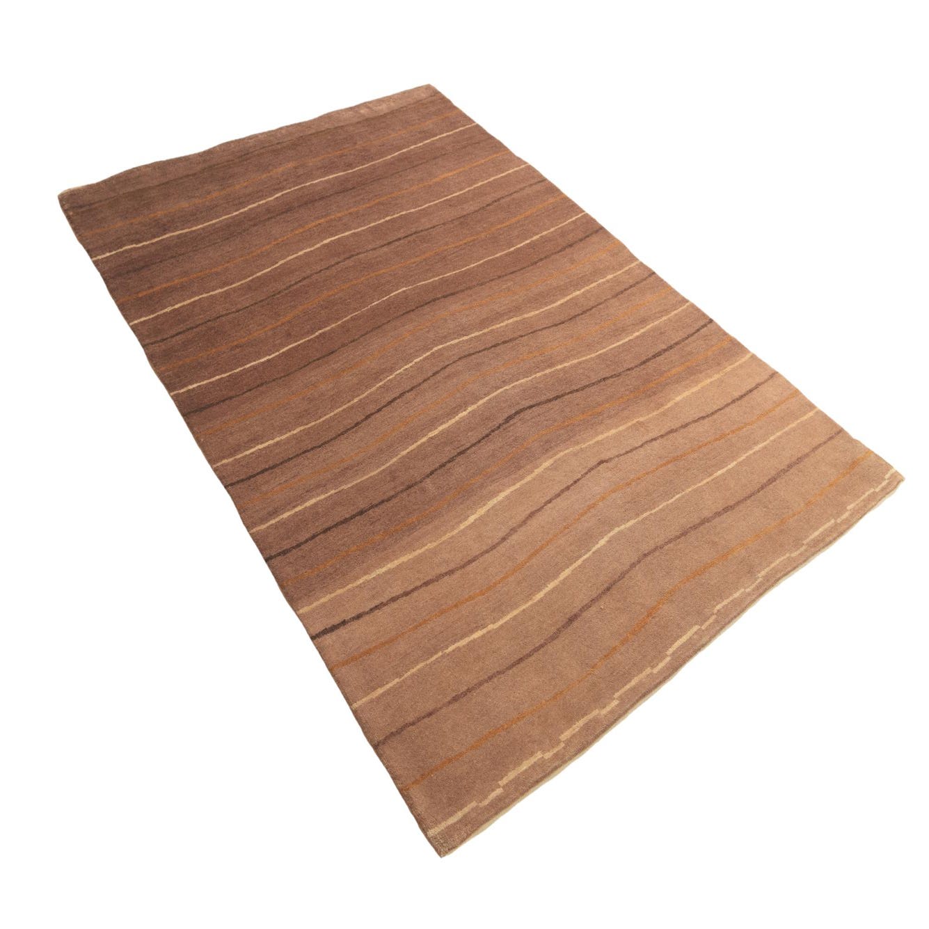 A 5x8 rectangular Kashkuli Gabbeh rug featuring a modern abstract pattern with varying shades of brown and tan horizontal stripes.
