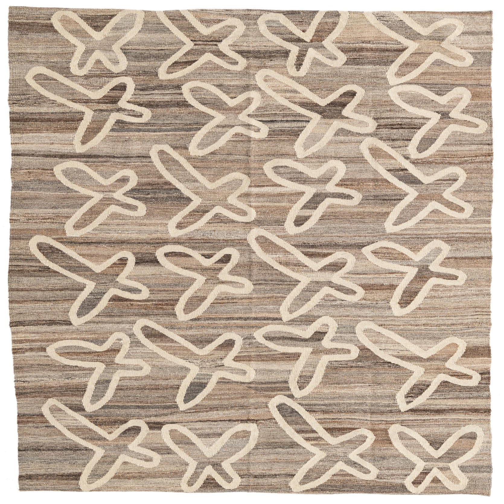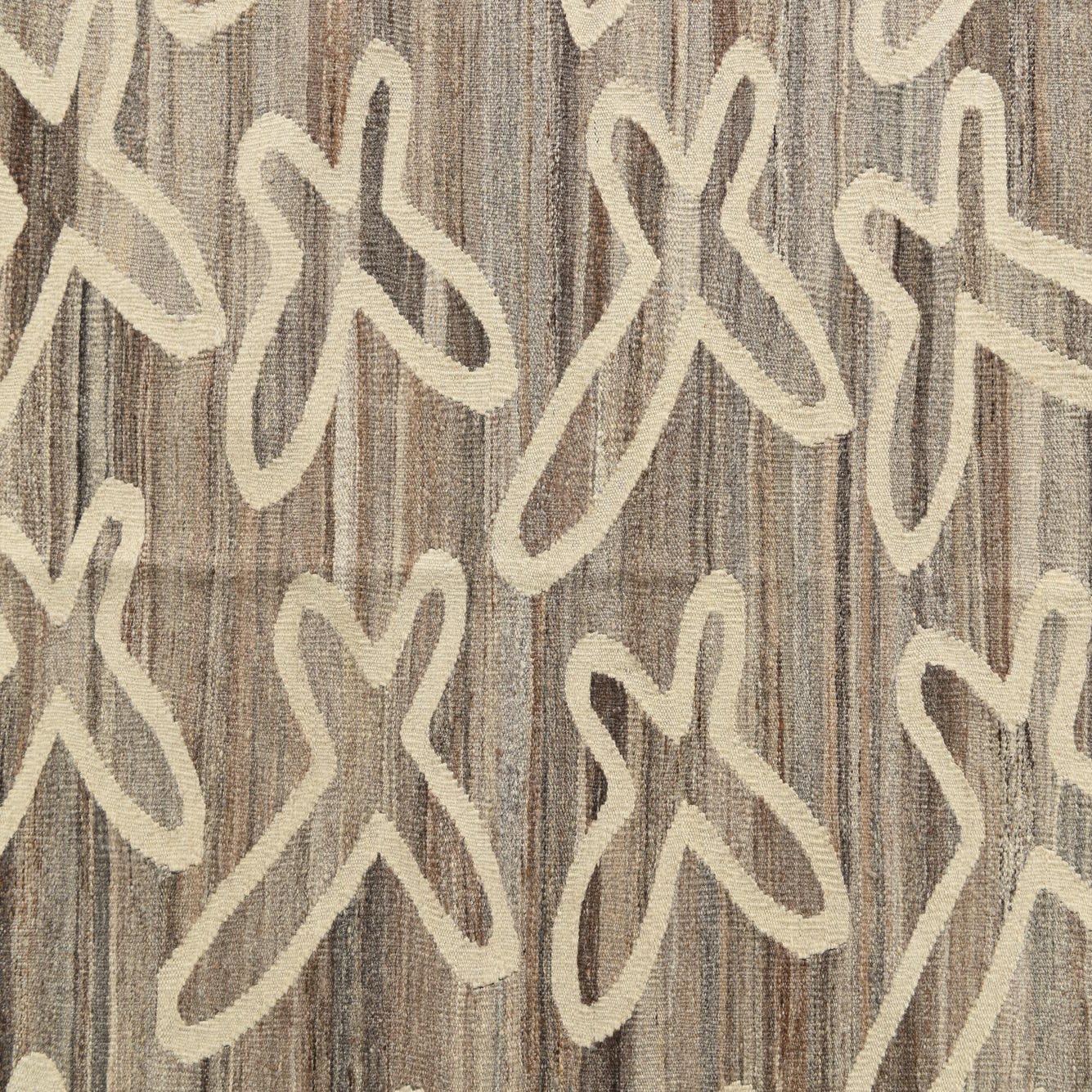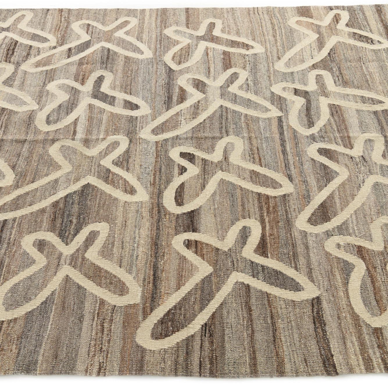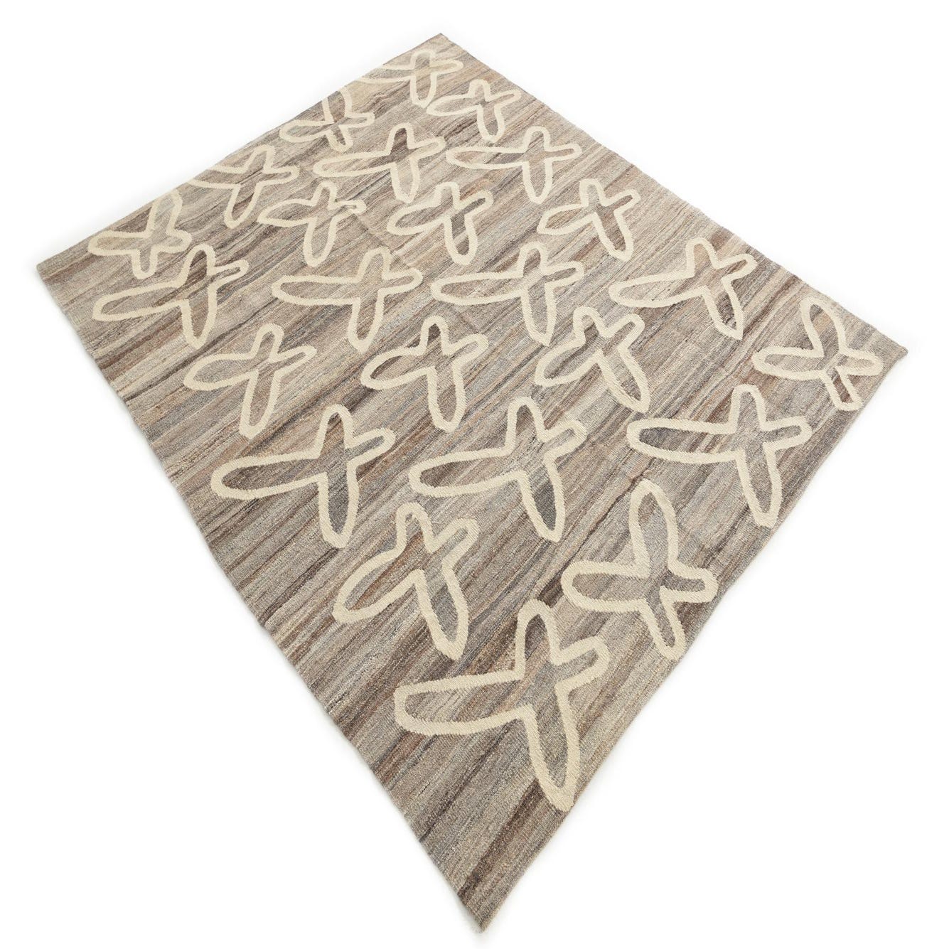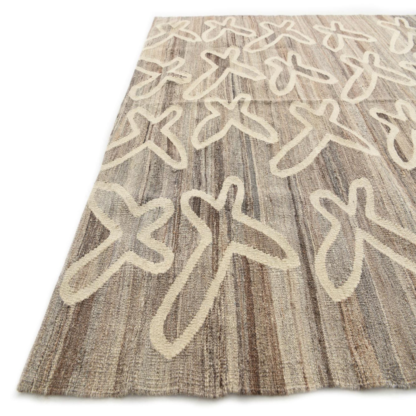 A hand-woven 100% wool flatweave with a warm brown ground, this rug carries a relaxed, modern look through its soft, striated background and repeating beige motifs. The pattern consists of loosely drawn, abstract cross-star shapes laid out in a casual grid, their clean outlines offering a gentle contrast against the layered brown tones. Running bands of brown and tan create a subtle, organic striping that gives depth to the surface while the natural wool construction provides a tactile, slightly textured feel underfoot.