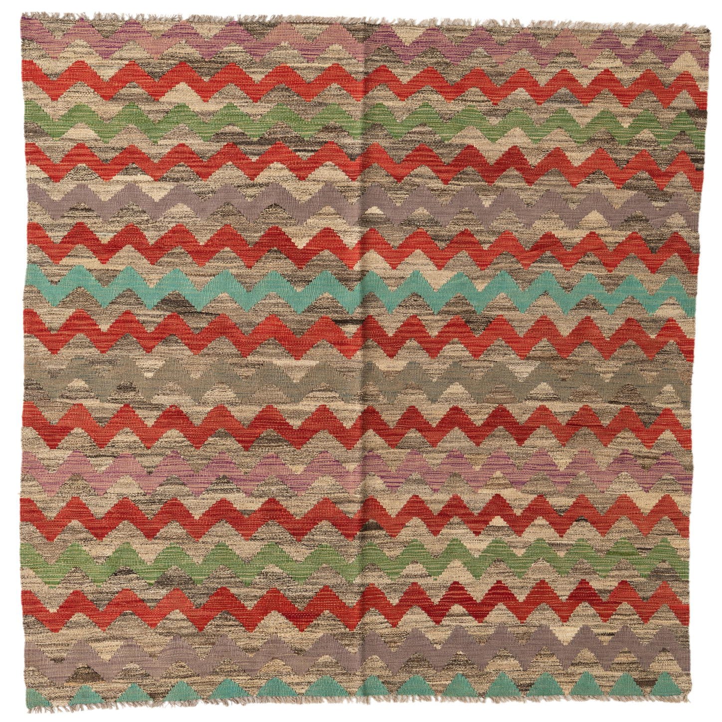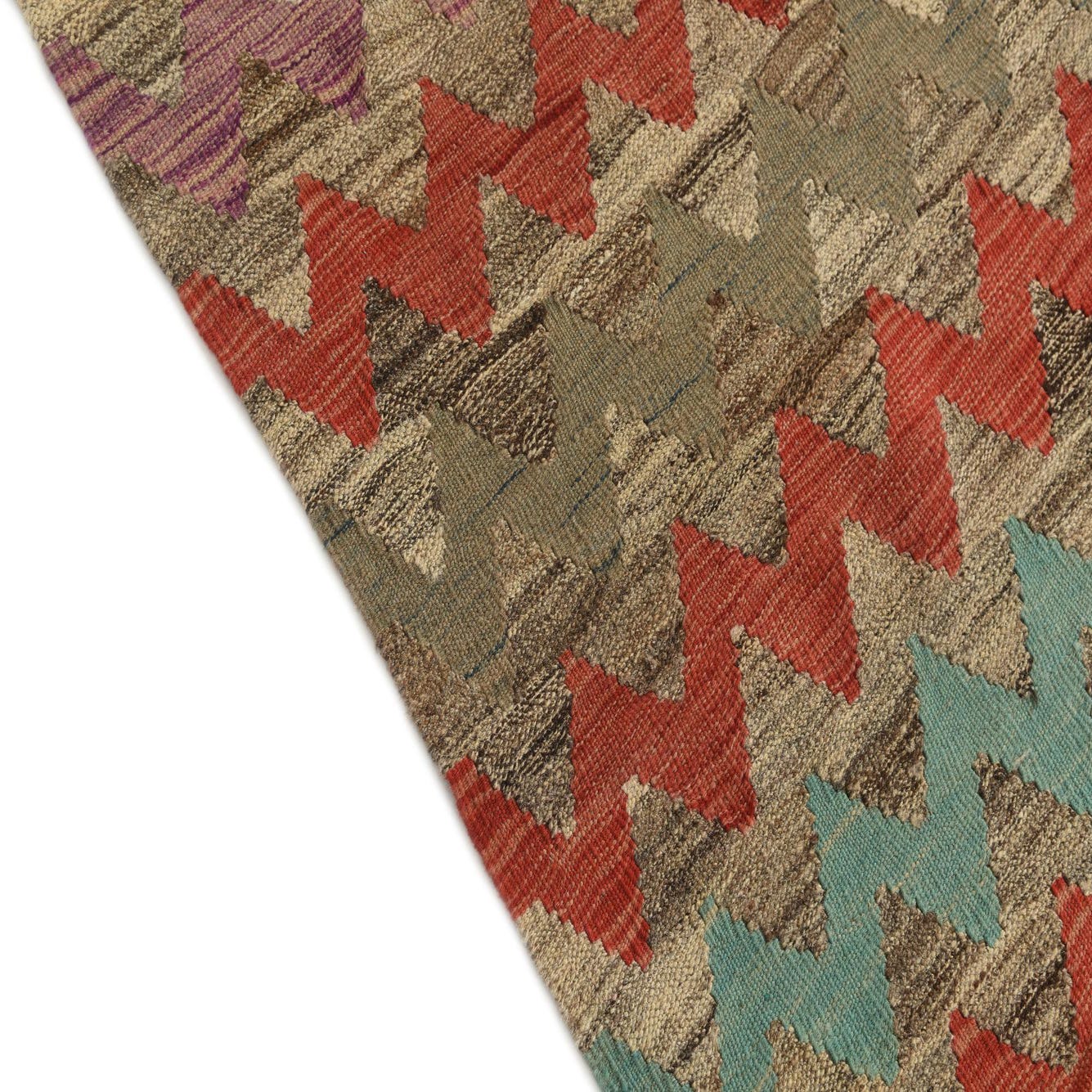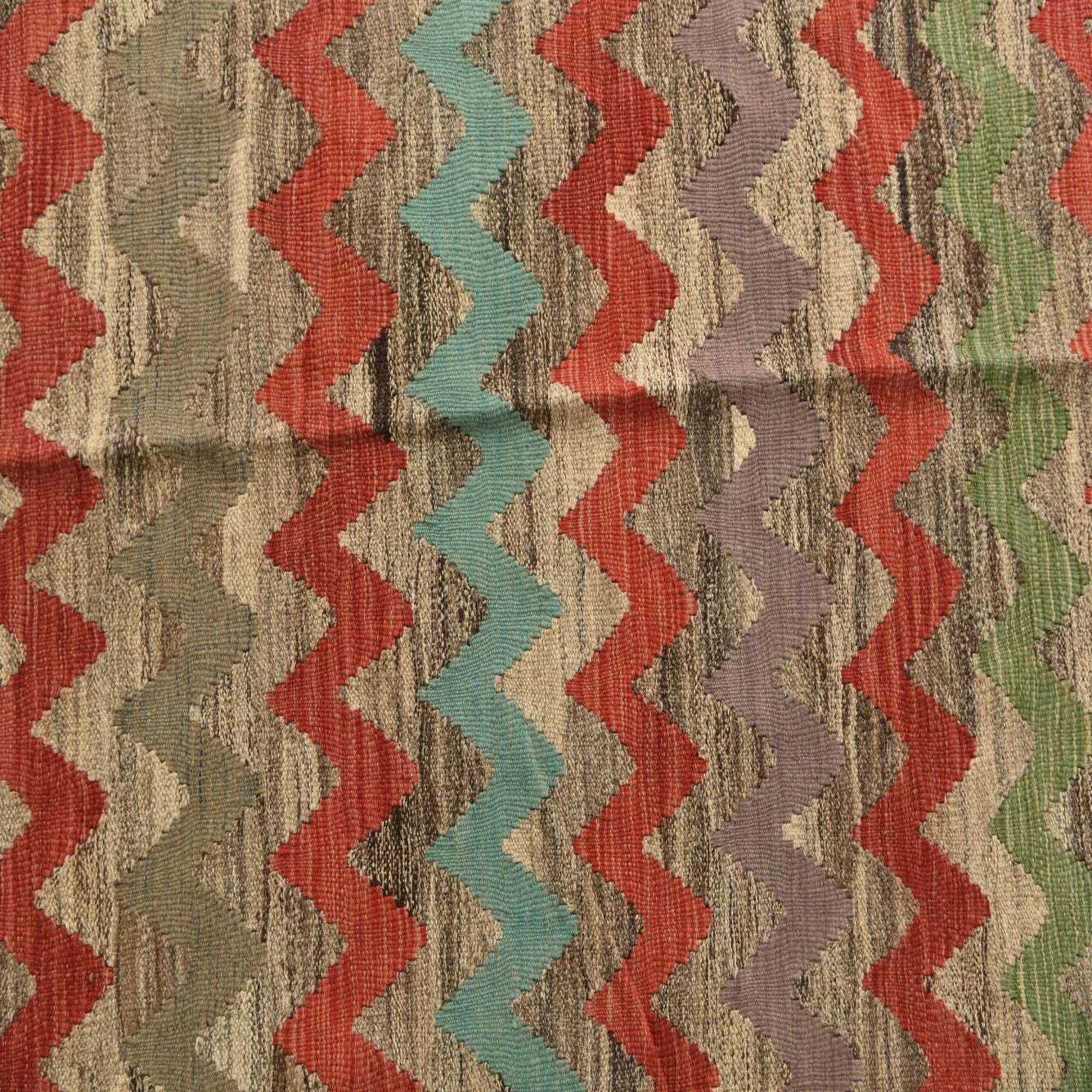 A 5x8 rectangular Kilim Modern wool rug featuring a vibrant zigzag pattern in red, green, teal, purple, and brown tones.