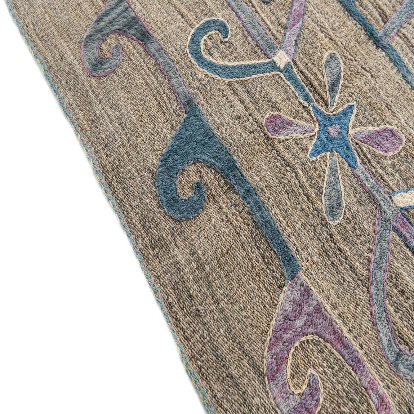 The flatweave construction contributes to the rug's slender profile and crisp detailing, making it an ideal choice for areas where doors swing over and high-traffic spaces. The Kilim Suzani rug suits a variety of interiors, from eclectic and bohemian spaces, where it can add a layer of visual interest without overwhelming the room, to more modern and minimalist settings, where its pattern can serve as a focal point. This rug also pairs well with natural wood furnishings and can complement both neutral and color-rich environments.