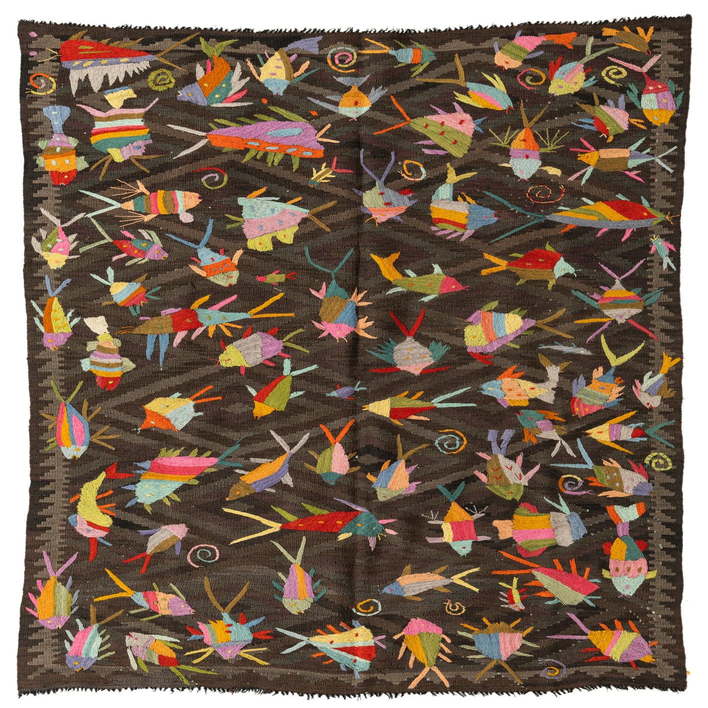 A 5x8 rectangular brown Kilim Suzani rug with a vibrant, colorful fish and swirl pattern, handmade from wool.
