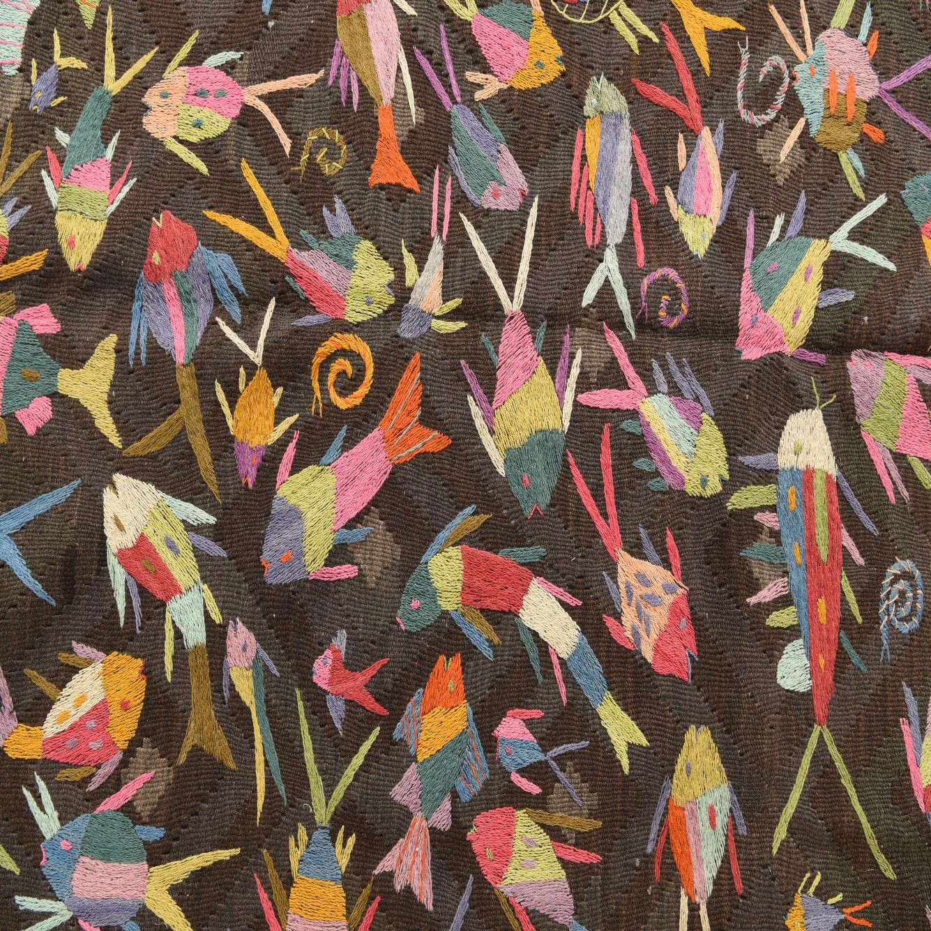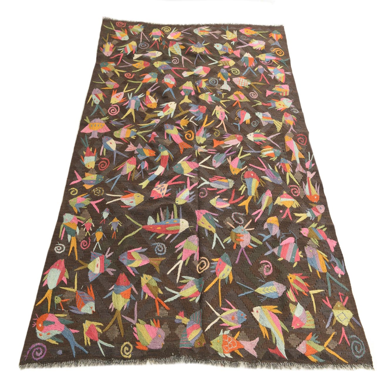 A 5x8 rectangular brown Kilim Suzani rug with a vibrant, colorful tribal fish pattern, ideal for a living room.