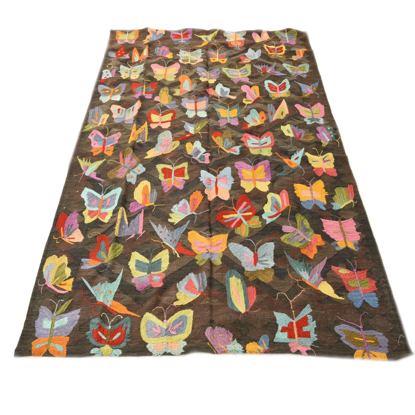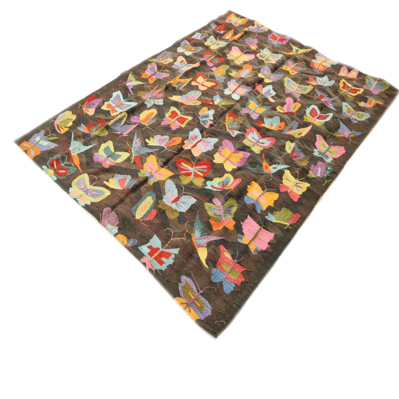 A rectangular 5x8 brown Kilim Suzani rug with a vibrant, colorful butterfly pattern, perfect for a living room.