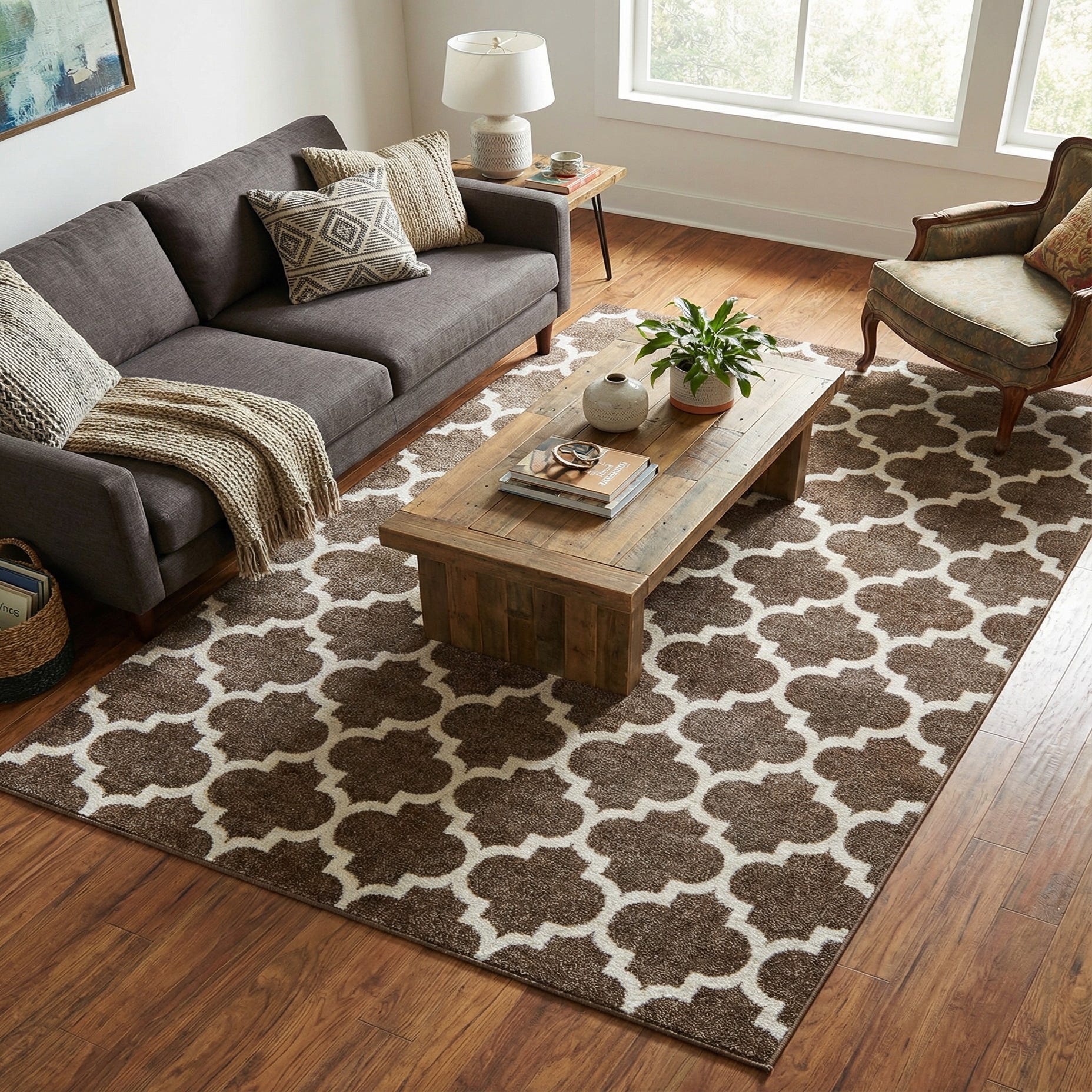 A warm brown field provides the backdrop for a repeating Moroccan quatrefoil trellis in soft beige, creating a classic geometric look that balances traditional and contemporary interiors. Machine-made from 100% polypropylene, the rug has a low, dense pile with a smooth, slightly plush hand that feels pleasant underfoot while remaining low-profile. The beige pattern reads crisp against the brown background, giving the design clear definition without adding visual heaviness.