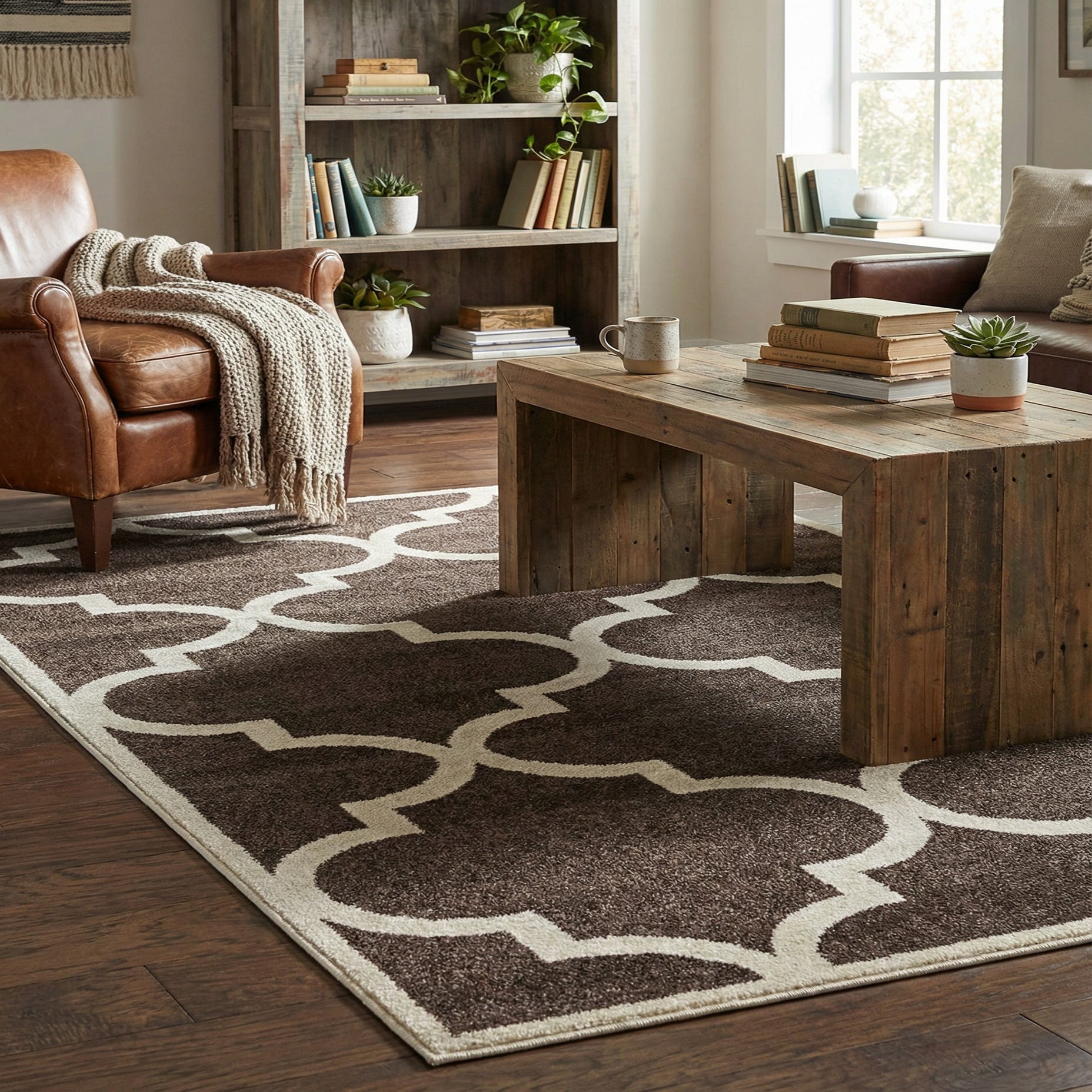 Warm brown provides the field for a bold, geometric lattice in soft beige, forming repeating Moroccan-inspired quatrefoil motifs that draw the eye across the surface. The beige lines are crisp against the brown background, giving the pattern clean edges and clear definition. Machine-made from 100% polypropylene, the rug has a low, dense pile with a soft hand and a subtle sheen that feels comfortable underfoot while maintaining a tidy, uniform appearance.