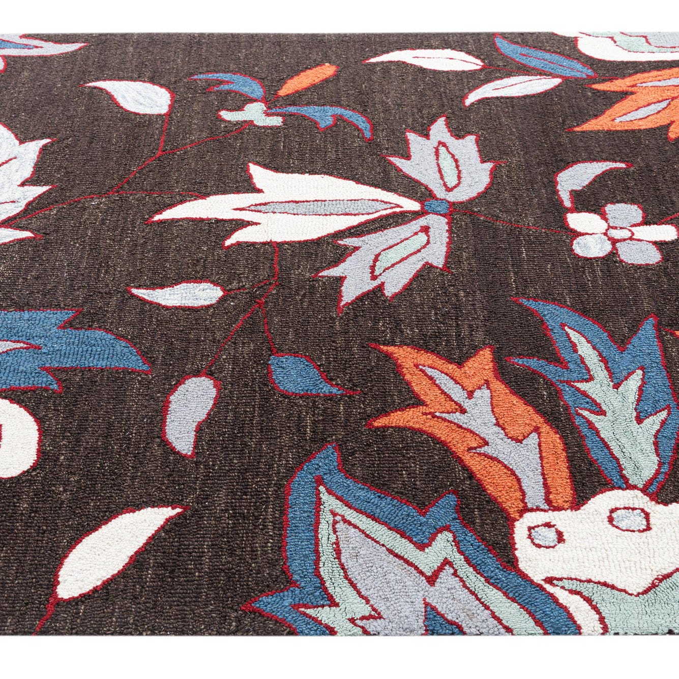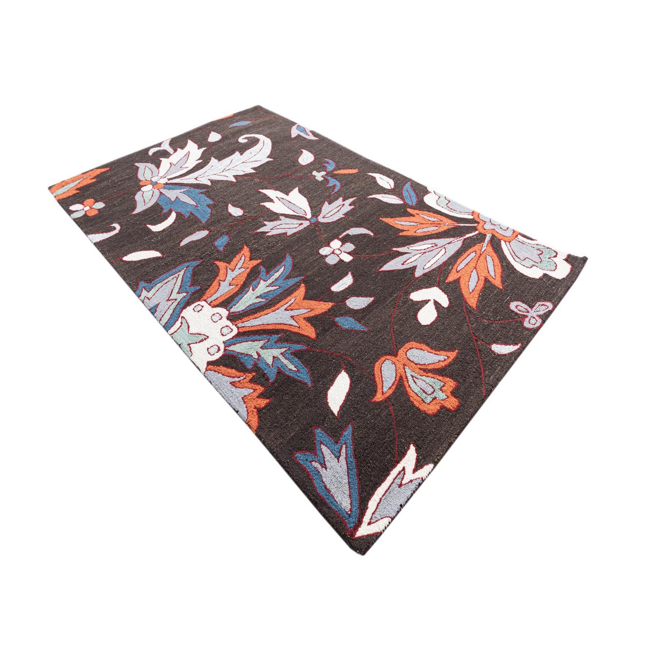 A 5x8 rectangular Luna rug with a dark brown background and large modern floral patterns in blue, orange, and white.