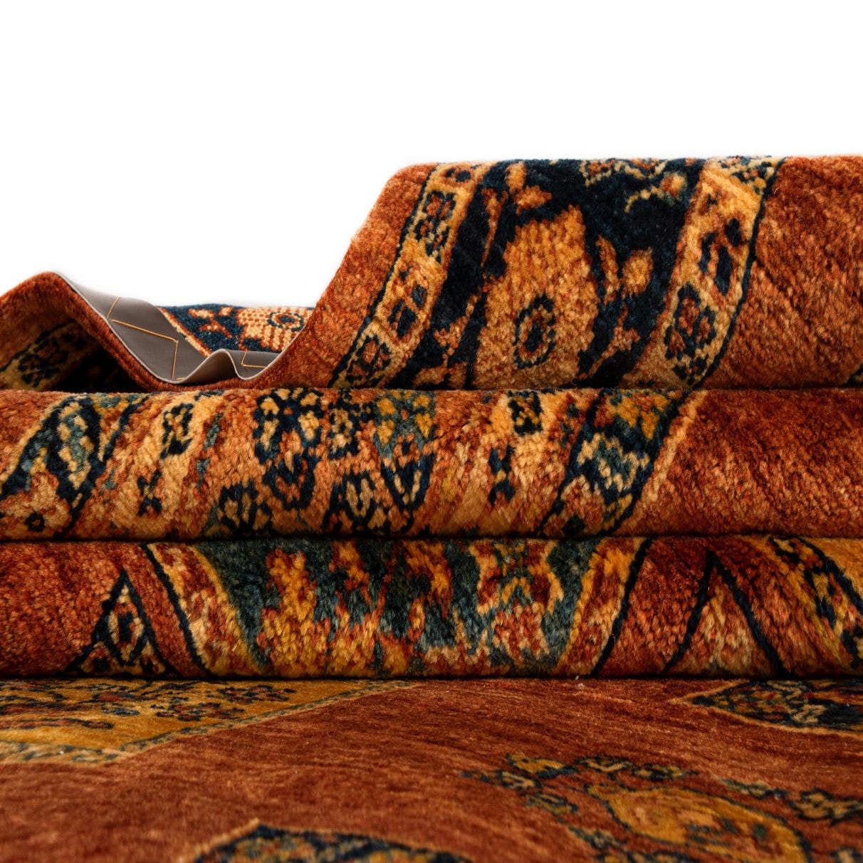 The texture of the wool brings a natural softness to the piece, providing both visual interest and tactile comfort. The traditional styling makes this rug well-suited for classic interiors, while its rich colors offer the flexibility to integrate with more eclectic and bohemian decor. It would serve as an inviting anchor in a living room, create a sense of sophistication in a dining area, or add warmth and character to a home office.