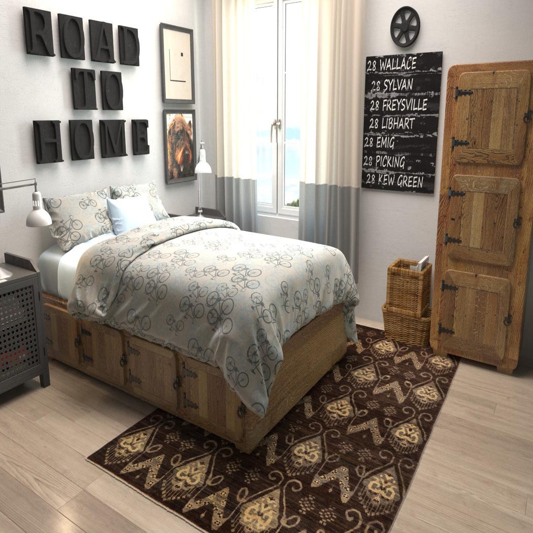 With its modern take on traditional motifs, this rug works well as an anchor in a living room beneath a sofa and coffee table, or placed under a dining table to add warmth to wood floors. It also complements a neutral bedroom palette when layered at the foot of the bed. Pair it with warm wood finishes, leather seating, and muted metal accents for a composed, transitional or contemporary setting.