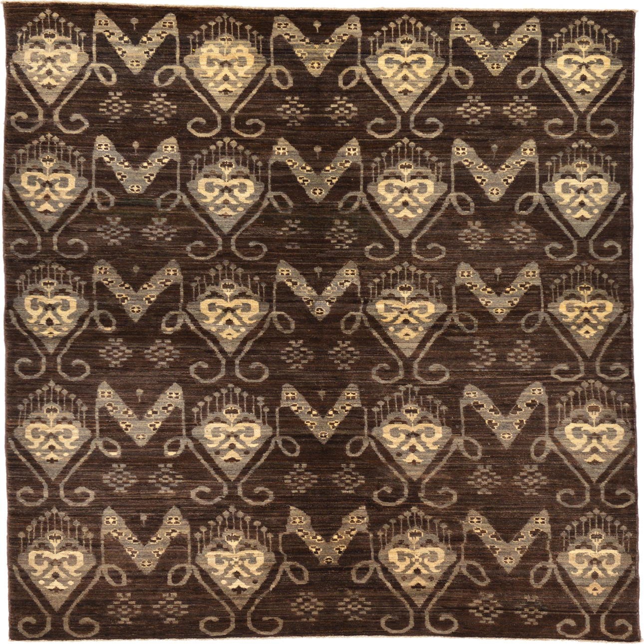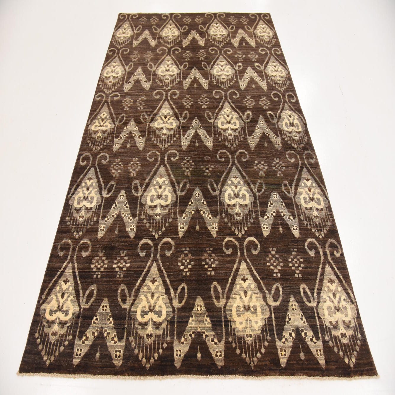 Hand-knotted from 100% hand-spun wool, this rug has a warm, tactile surface with low-to-medium pile that invites bare feet. A deep brown field sets the stage for a repeating, ikat-inspired motif of stylized heart-shaped medallions and V-forms, rendered in soft beige and cream. The hand-spun wool creates gentle tonal striations and a slightly varied surface that gives the pattern depth and a lived-in, natural texture.