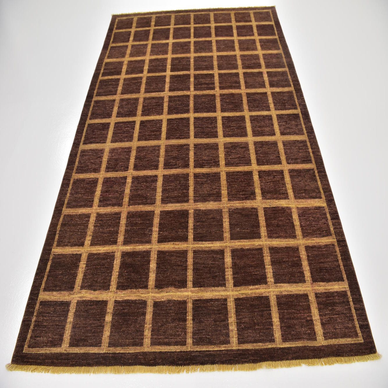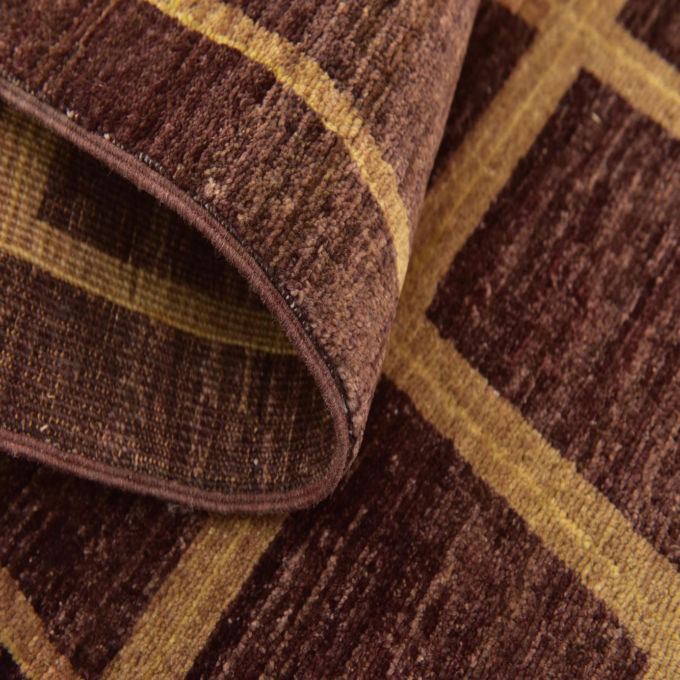 The Modern Ziegler rug is a refined addition to any space, boasting a hand-knotted construction of 100% hand-spun wool. Its dimensions, a versatile 5x8, allow it to comfortably fit a variety of room sizes. The pattern features a contemporary grid design with clean lines that create a sense of structure and sophistication. The color palette consists of brown, cream, and light brown, anchored by a rich brown background that provides depth and warmth to the piece. The texture is characteristic of hand-spun wool, offering a tactile experience that adds to the overall aesthetic appeal.