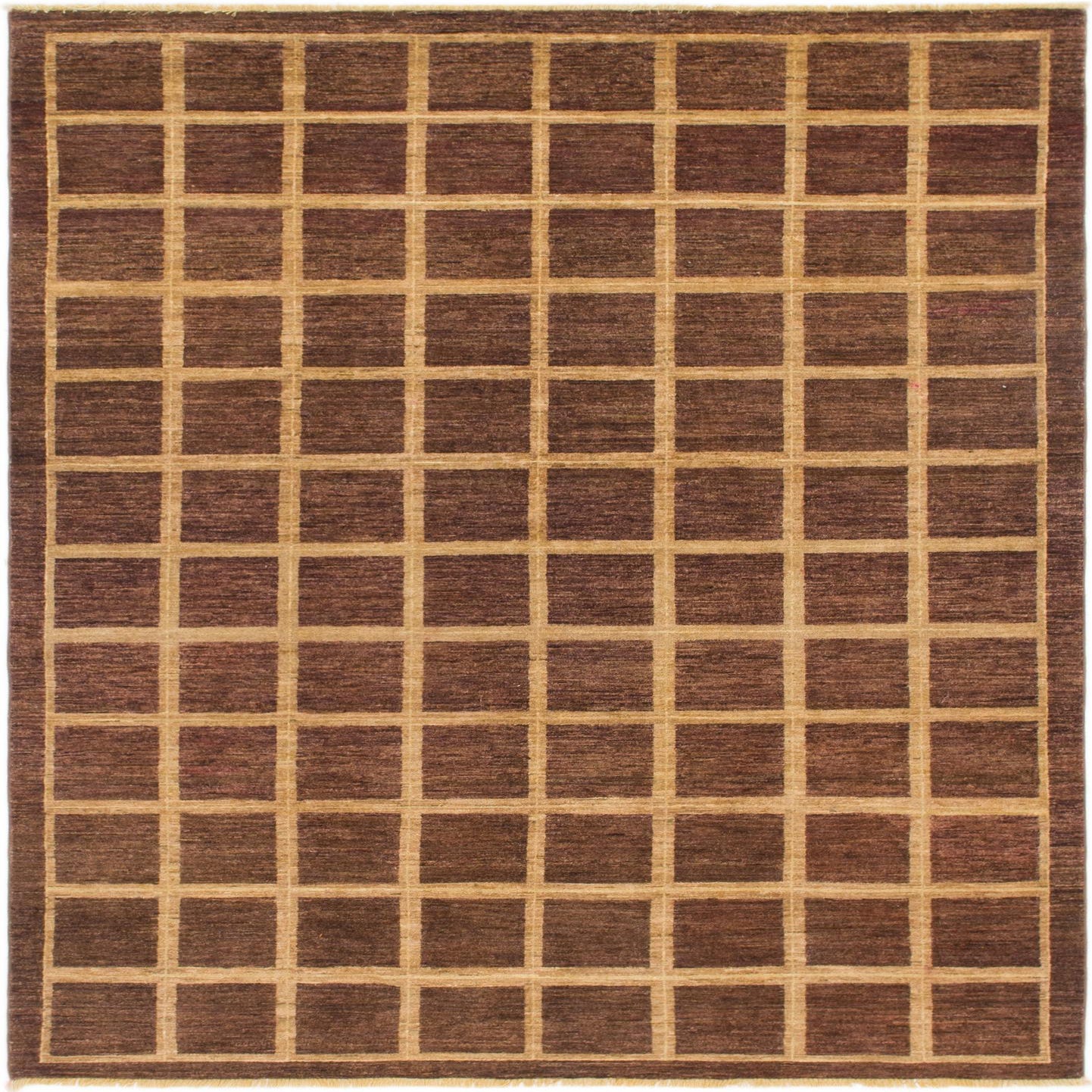 A 5x8 rectangular Modern Ziegler rug featuring a grid pattern with tan lines on a rich brown background, suitable for a living room.