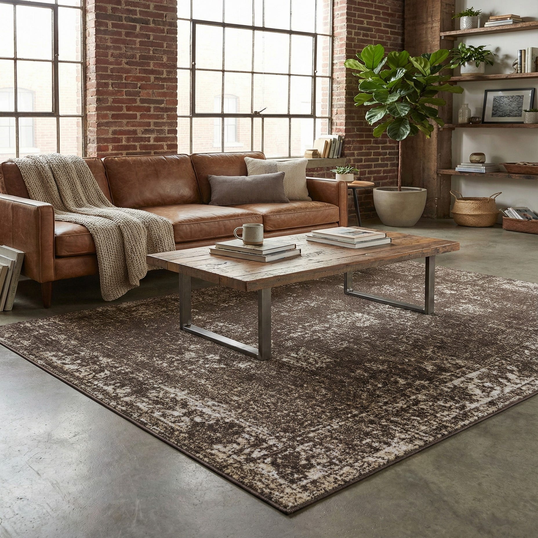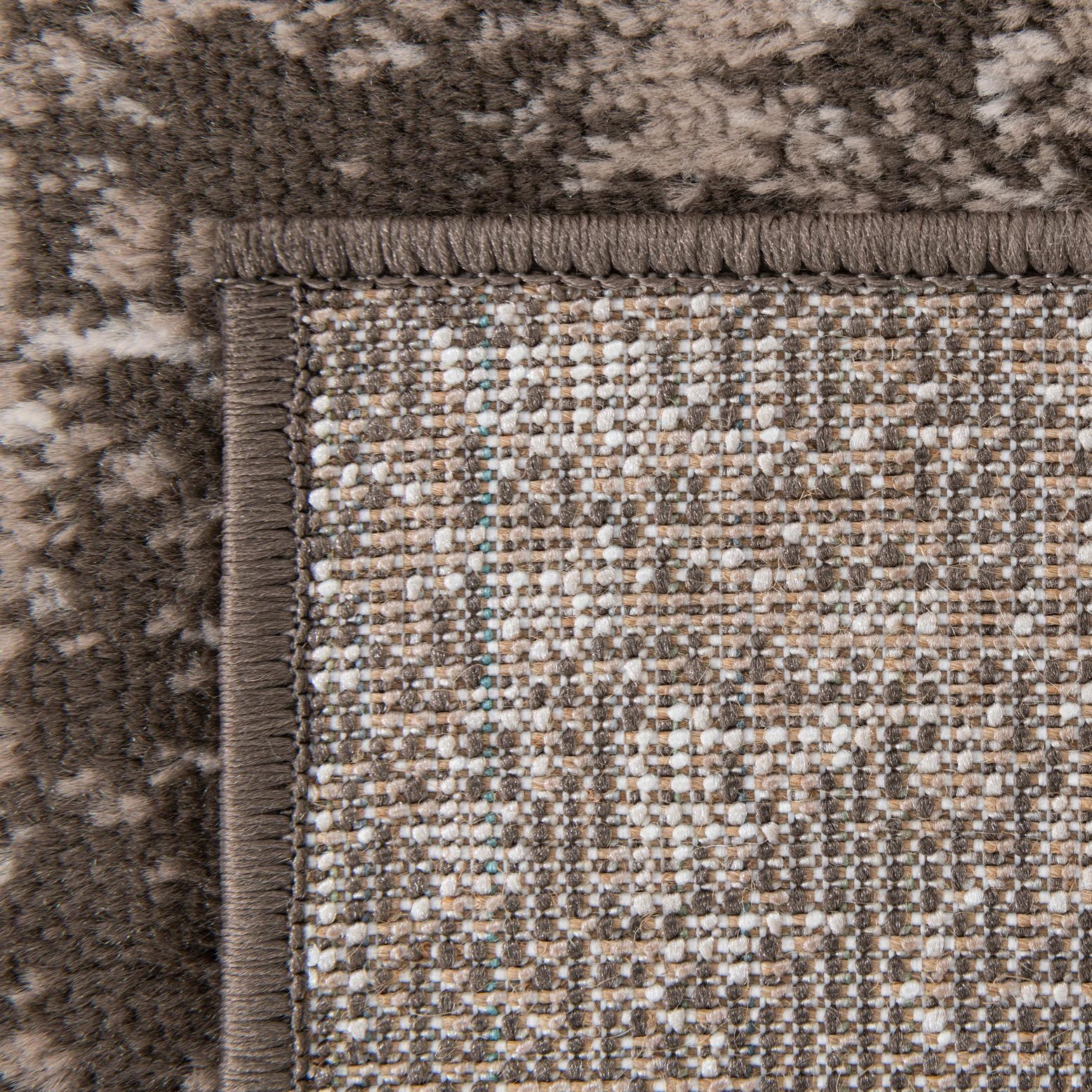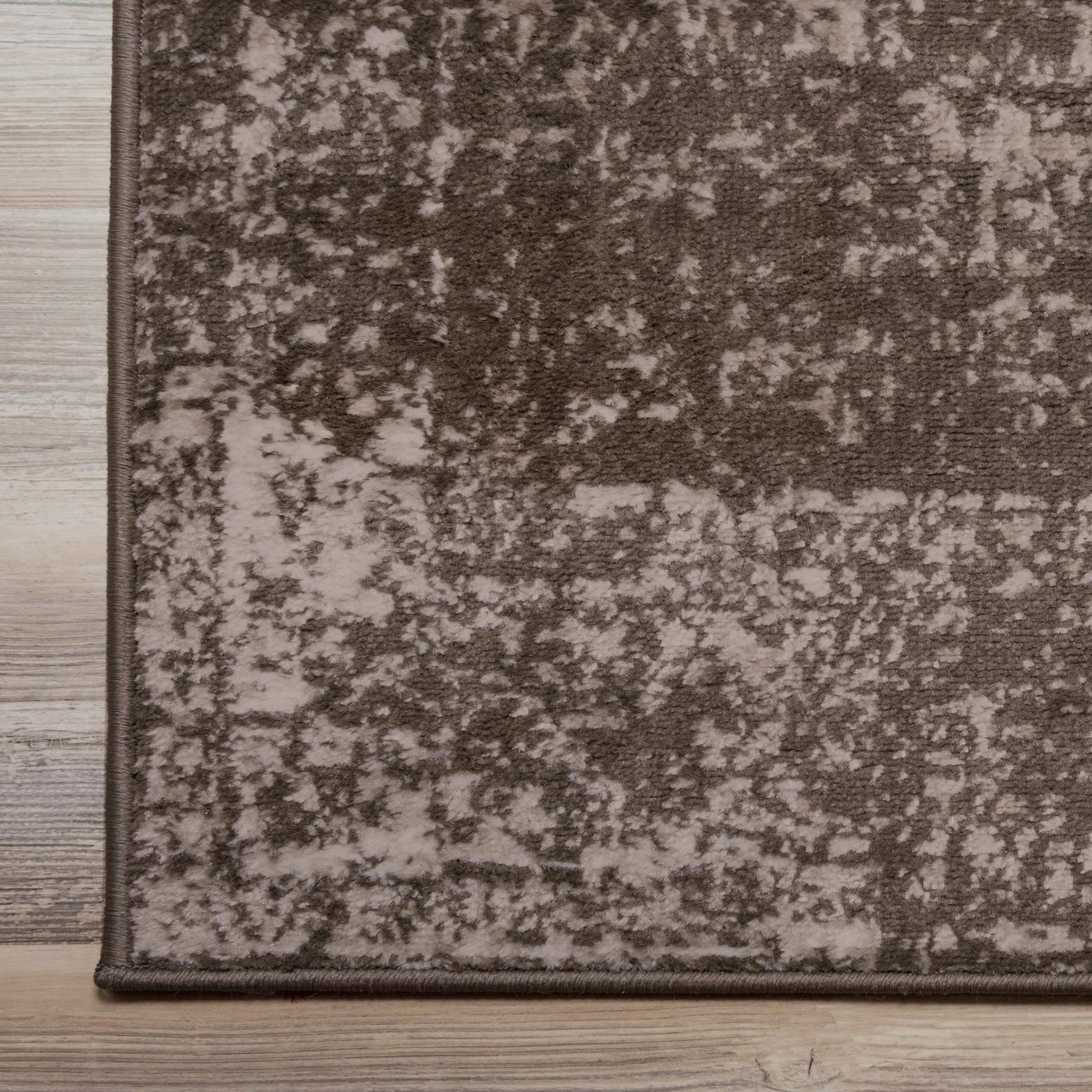Primary color is Brown. Colors in this rug include: Brown, Ivory, Tan.