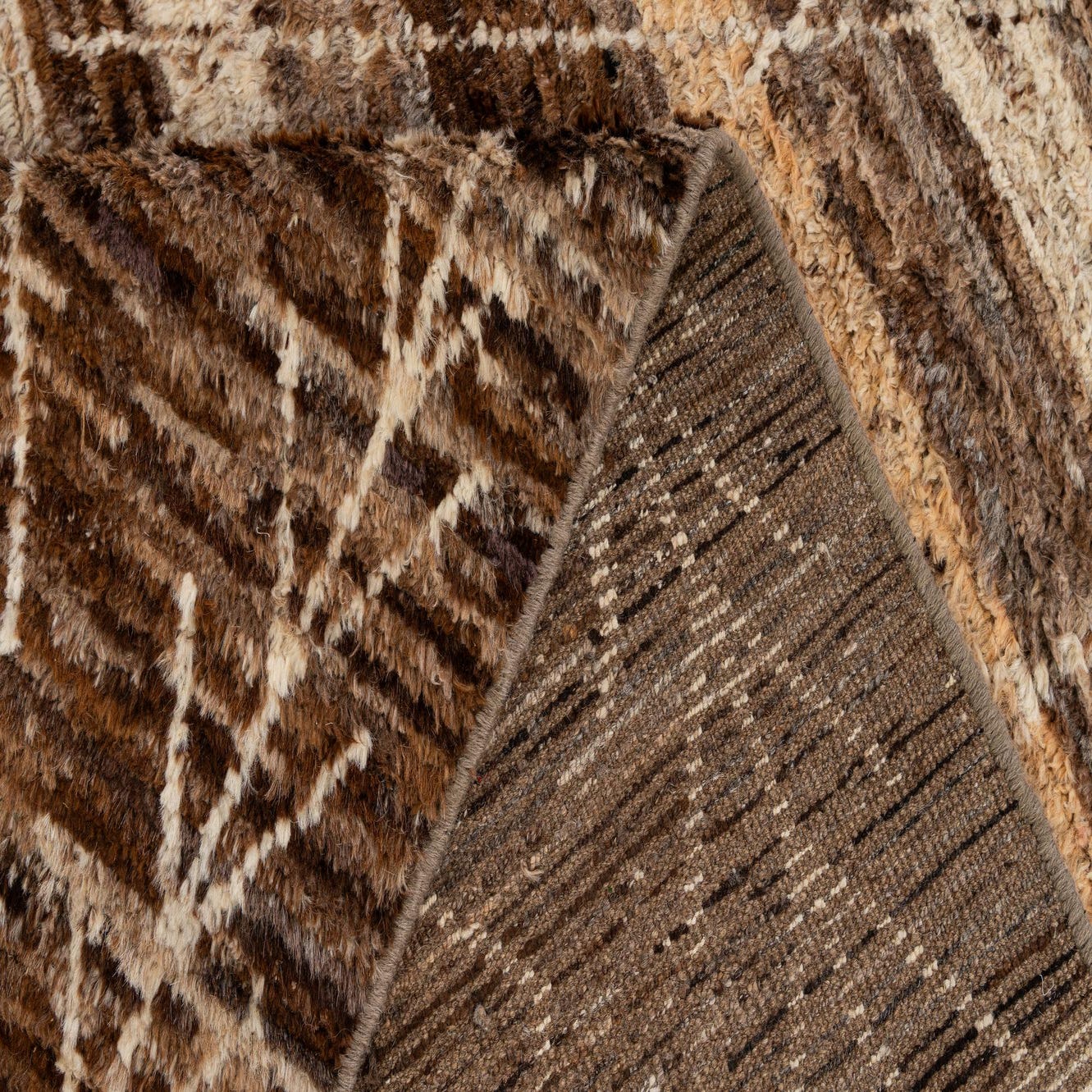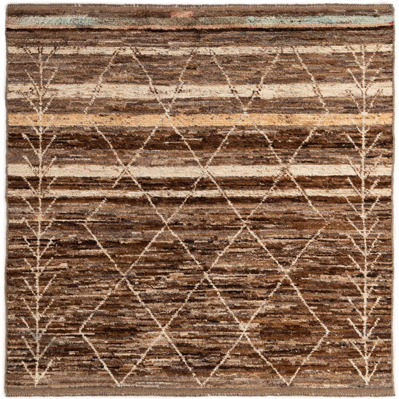 A 5x8 rectangular Moroccan wool rug featuring a tribal diamond pattern in various shades of brown and tan.