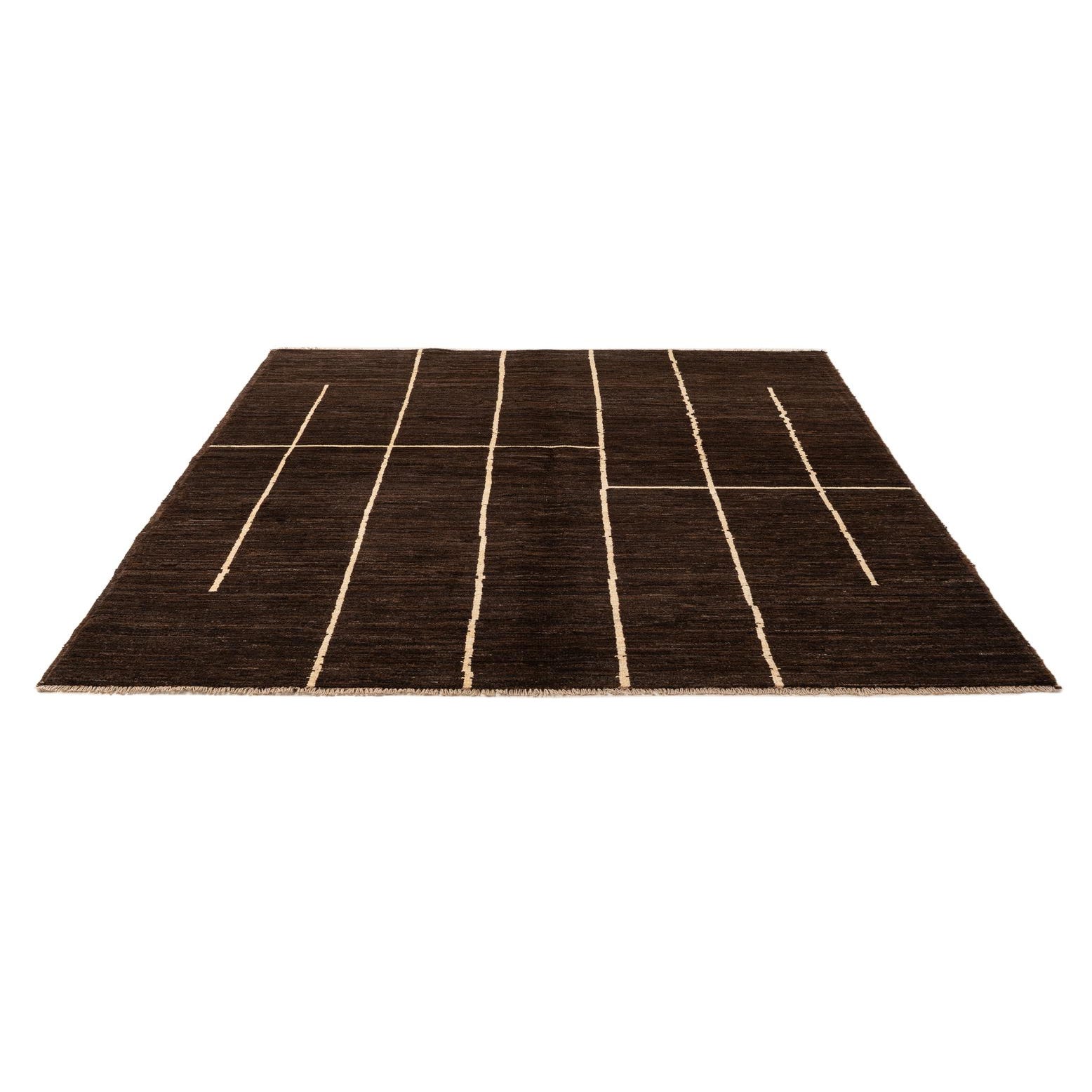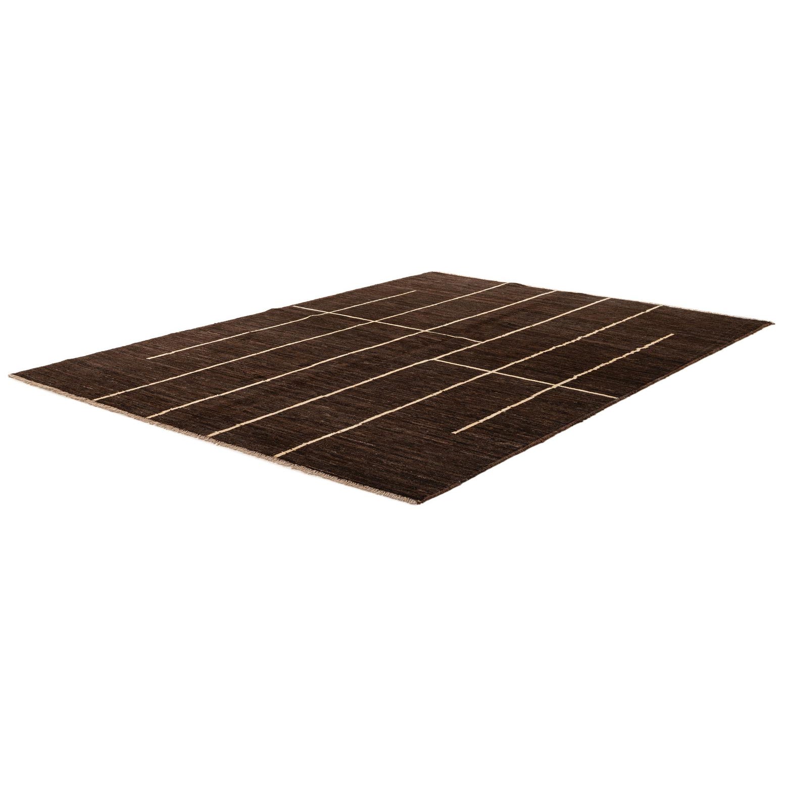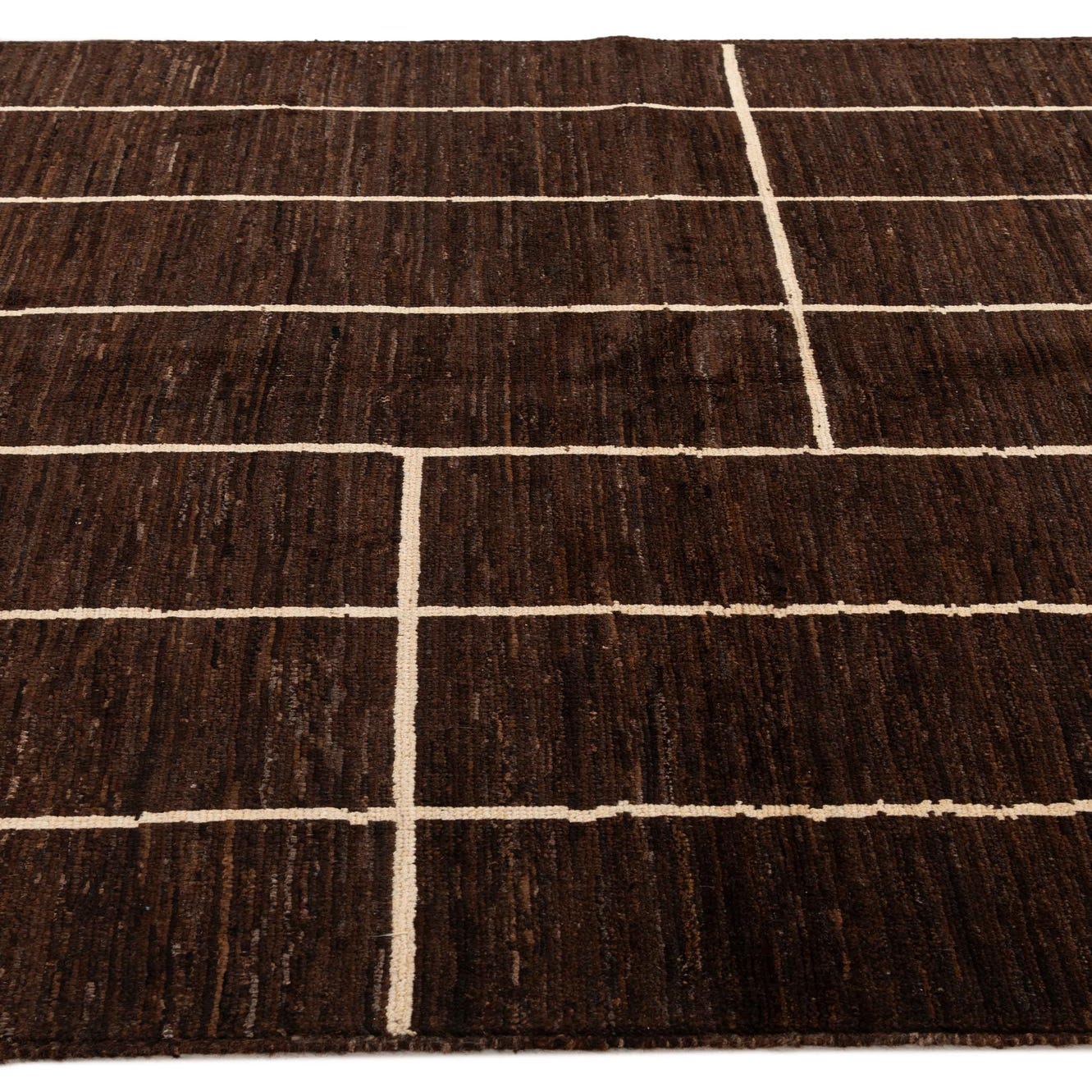 A 5x8 rectangular brown tribal rug with a modern grid pattern of tan lines, suitable for a living room.
