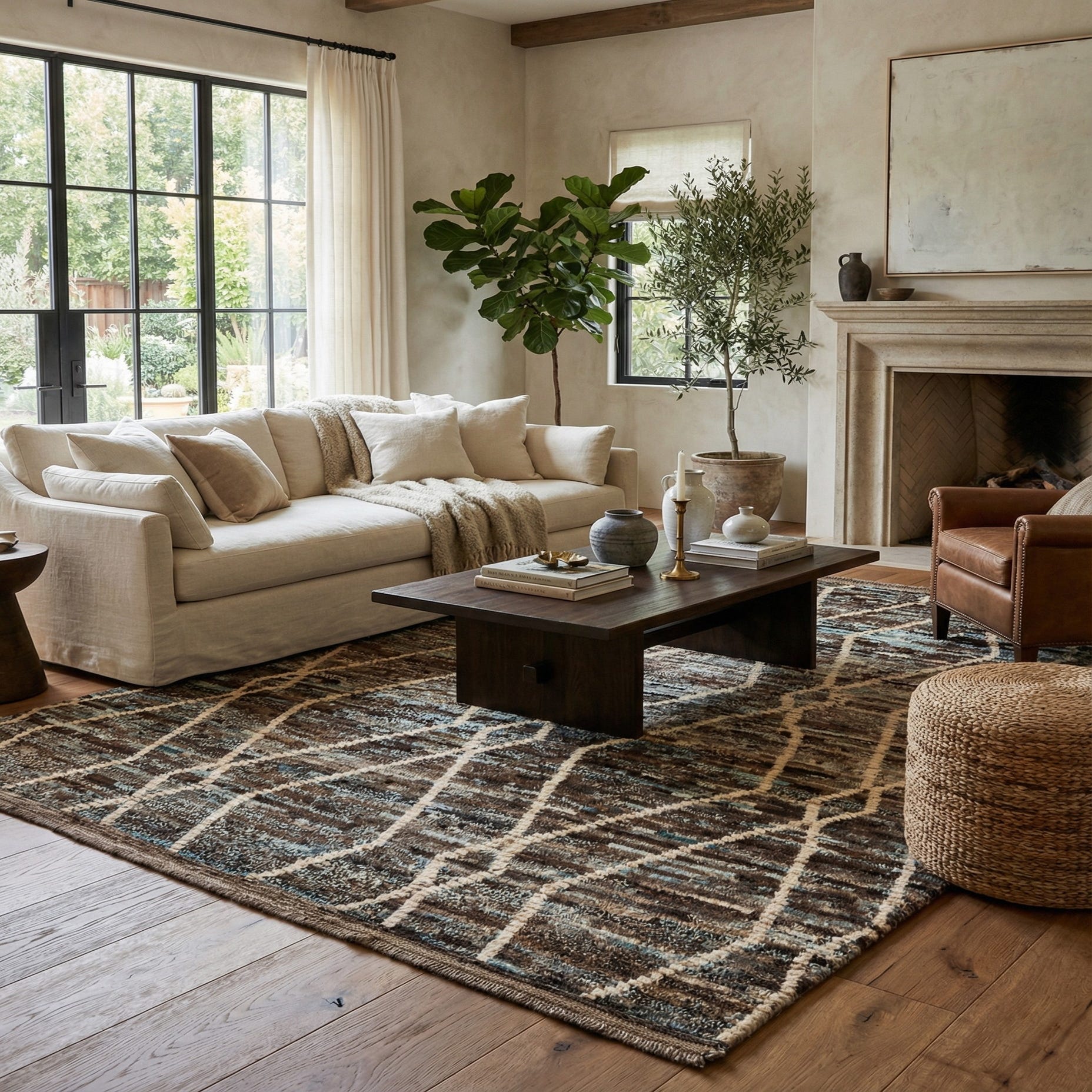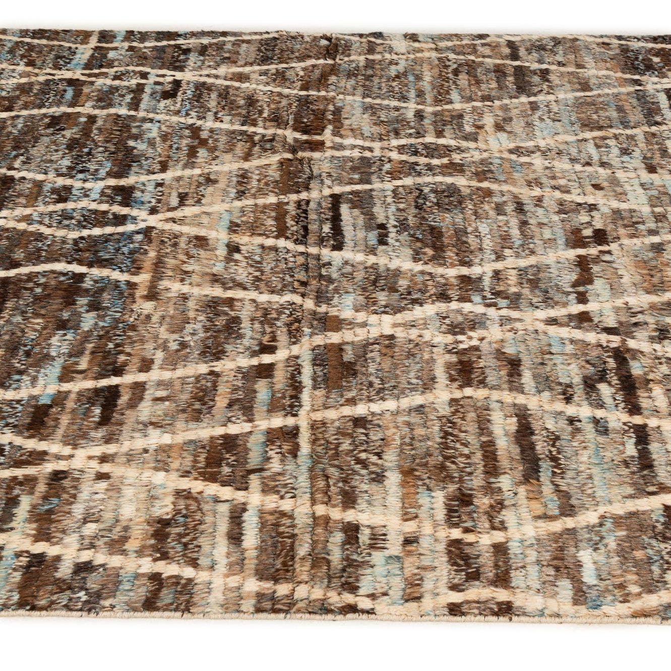 A 5x8 rectangular Moroccan wool rug featuring a tribal diamond pattern in shades of brown, tan, and light blue.